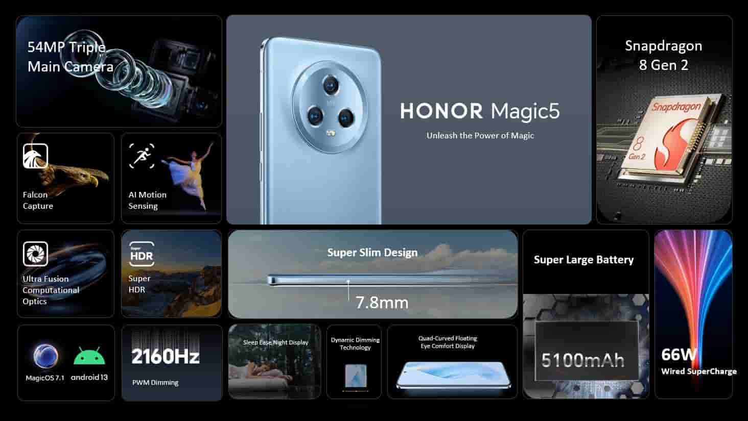 The smartphone sports a 6.73 OLED Quad curved floating screen that offers a 120 Hz refresh rate. The device comes with Dynamic Dimming technology and a sleep ease night display. It is powered by Qualcomm Snapdragon 8 Gen 2 processor which is paired with up to 12GB RAM and 256GB internal storage. It runs on MagicOS 7.1 based on Android 13. The device houses a 5100mAh battery that supports 66W wired Supercharge.