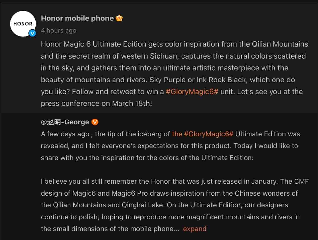 Today the color variants of Honor Magic 6 Ultimate Edition have also been revealed by the company on the Weibo platform.