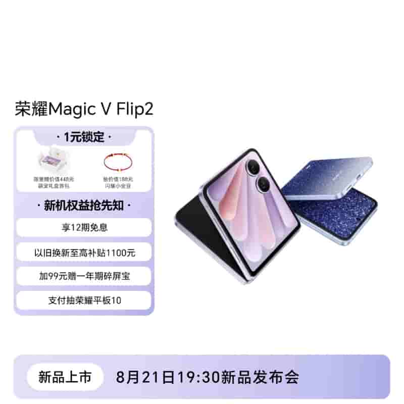 The successor of the June 2024-released Magic V Flip, Honor’s upcoming Magic V Flip 2 smartphone will be having its official launch next week in the Chinese market, on the 21st of August 2025 at 7:30 PM local time. In addition to the Professor Jimmy Choo collaborated Dark Blue color variant, the device will also be made available in Purple, White, and Grey colors too. Also, a CNY 1 New Phone Benefits Gift Package has also been announced and customers booking it can enjoy free goodies worth CNY 448 (~ Free Cute Pet Gift Box, Gift Coupon Pack, Gold Bean Draw).