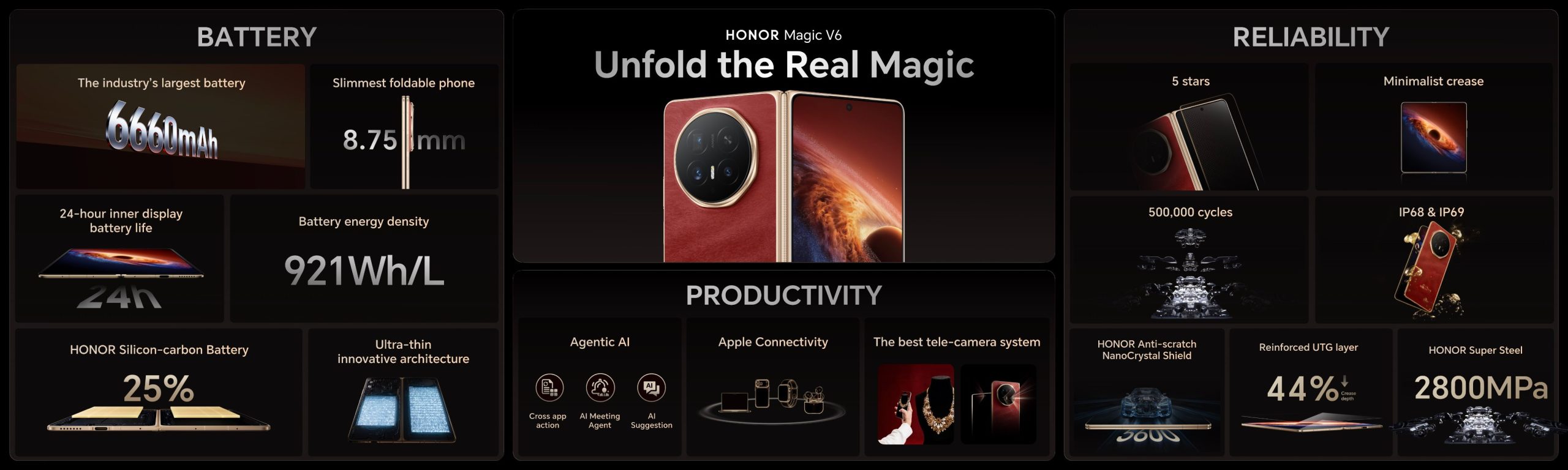 It offers both IP68 and IP69 ratings. It comes with Honor Super Steel (2800MPa) for the hinge and a reinforced UTG layer that is 44% stronger. It is equipped with Honor Anti-Scratch NanoCrystal Shield glass and comes with SGS high-quality durable folding certification (rated for 500,000 folds).