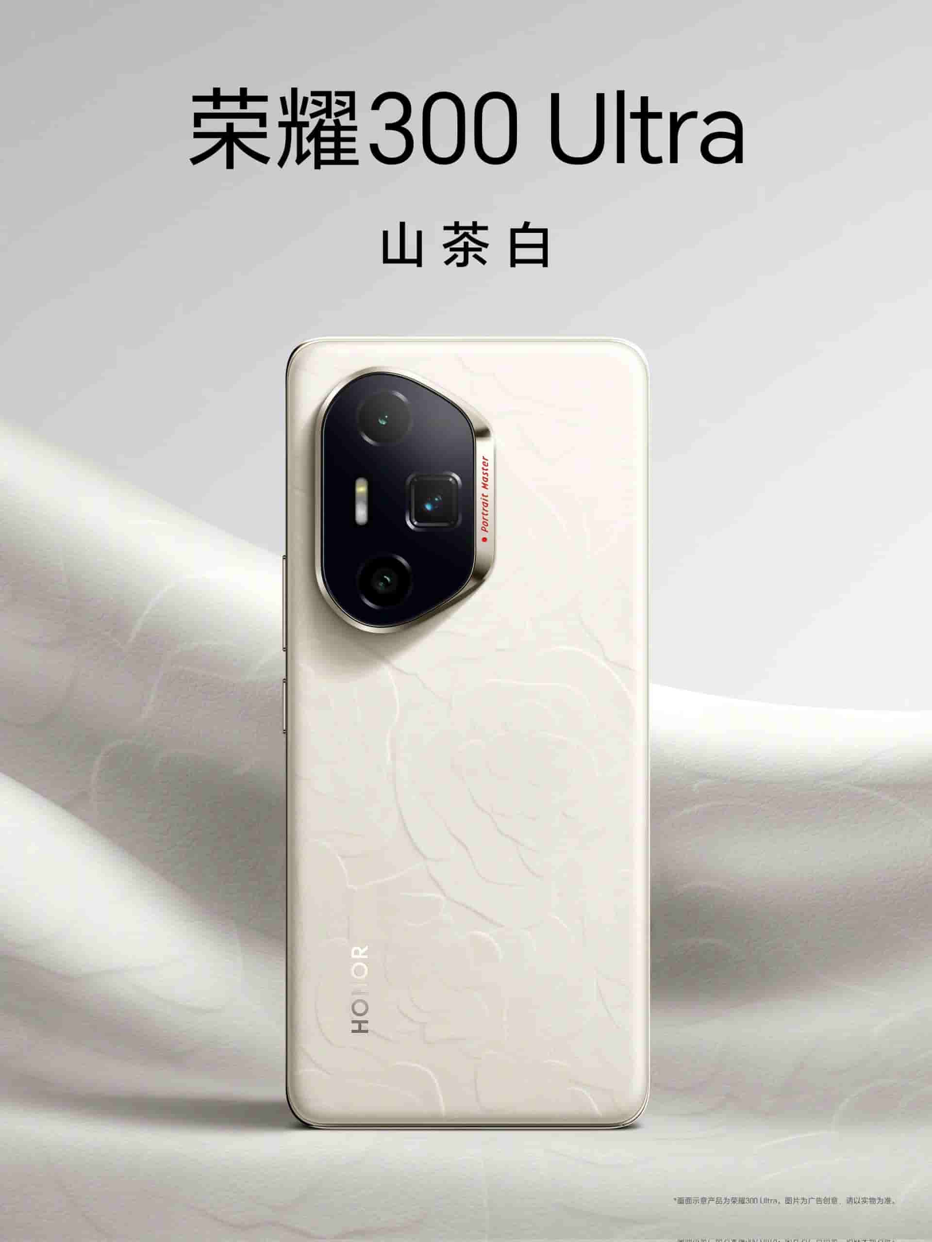 Honor 300 Ultra will come in two color options Camellia White and Ink Rock Black. The Black variant features a plain rear panel while the white variant features a textured design. The camera module is similar to the Vanilla and Pro models but the camera lenses seem to be different in the Ultra model. On the camera module Portrait Master is written with red color.