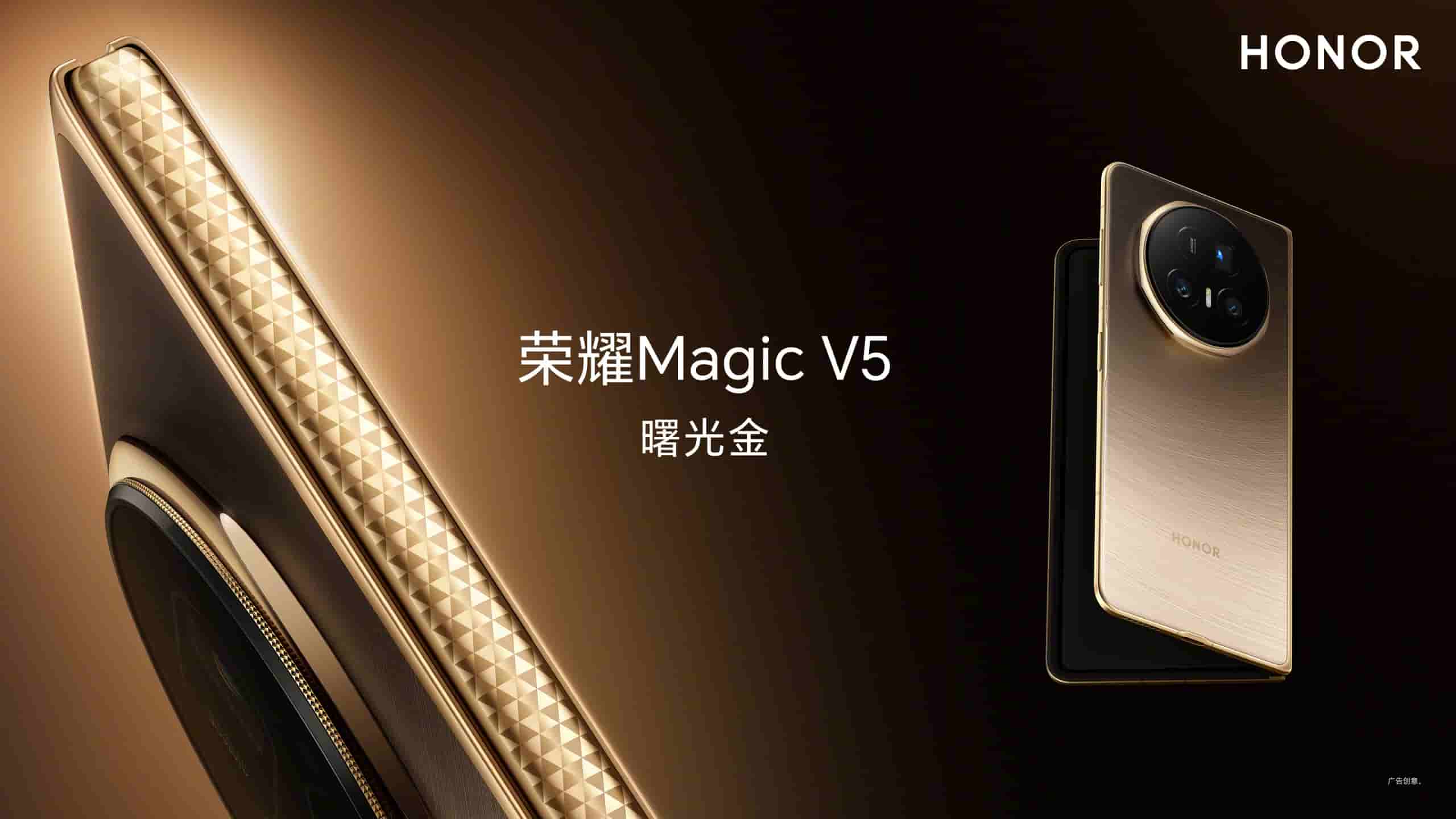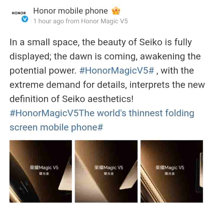 As per the newly shared teaser updates, the Honor Magic V5 which is said to arrive as the thinnest and lightest foldable of the market, is revealed to be 8.8 mm thin when folded. Additionally, it is also claimed to be light and will float in water. The device will be equipped with AI capabilities, productivity features, and seamless connectivity. On its design side, Seiko aesthetics are going to be featured, with a brushed rear panel, triangular-patterned hinge, and an octagonal-shaped rear camera module with a Golden border. About its camera specs, a triple camera setup is present, among which one is a periscope telephoto lens. There is also an LED light strip within the camera module.