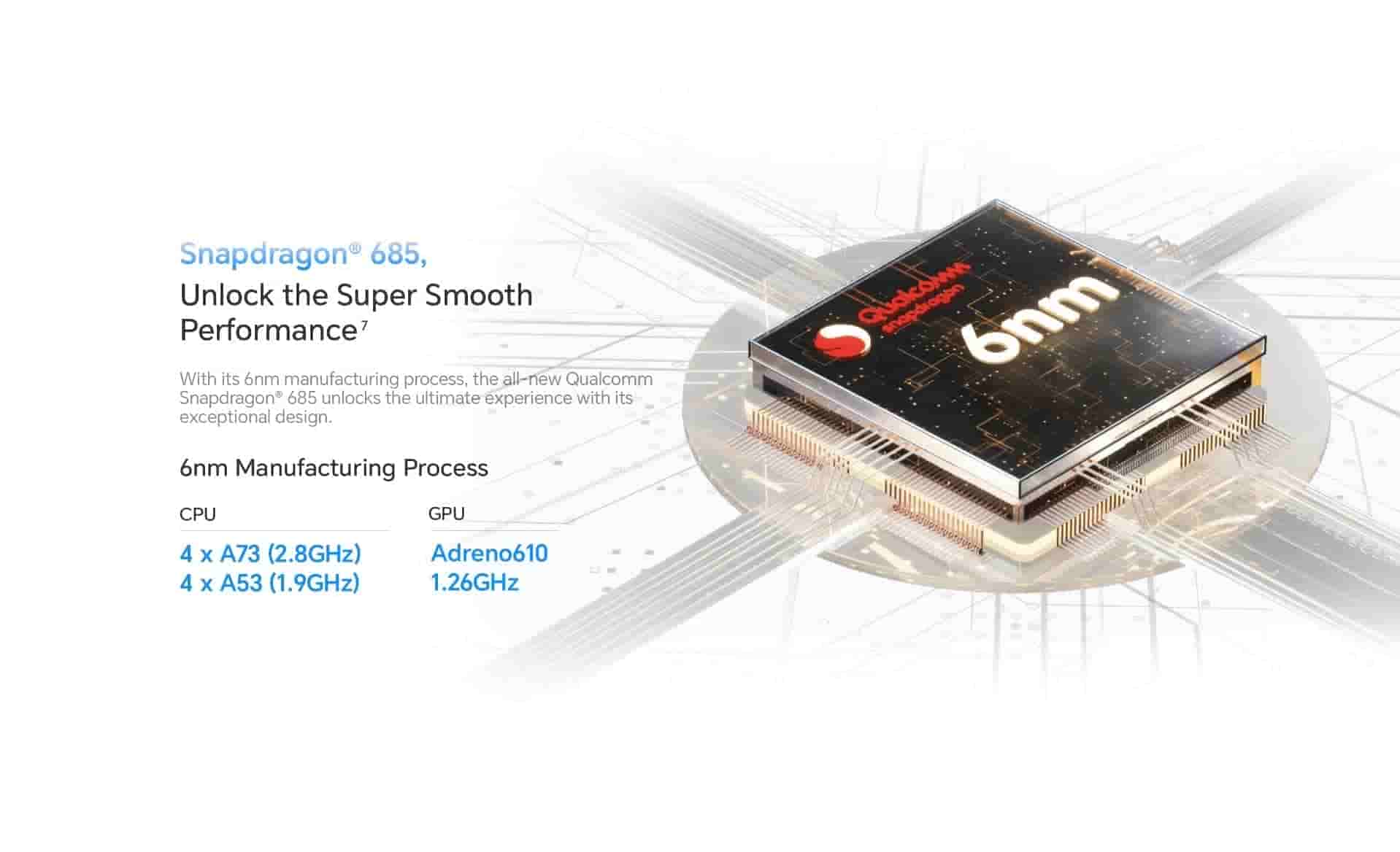 The device processes on Qualcomm 6nm Snapdragon 685 processor chipset and runs on Android 13.