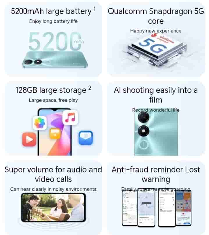 The device packs up a 13MP main rear camera and 5MP front camera. Video recording on this device is possible with 1080p resolution. It is backed by a 5200mAh battery. It runs on MagicOS 7.1 based on Android 13. Other features are- natural light-like eye protection, Hi-Res audio, face unlock, fingerprint scanner, Bluetooth 5.1, Wi-Fi, 3.5mm audio jack, and anti-fraud reminder loss warning.