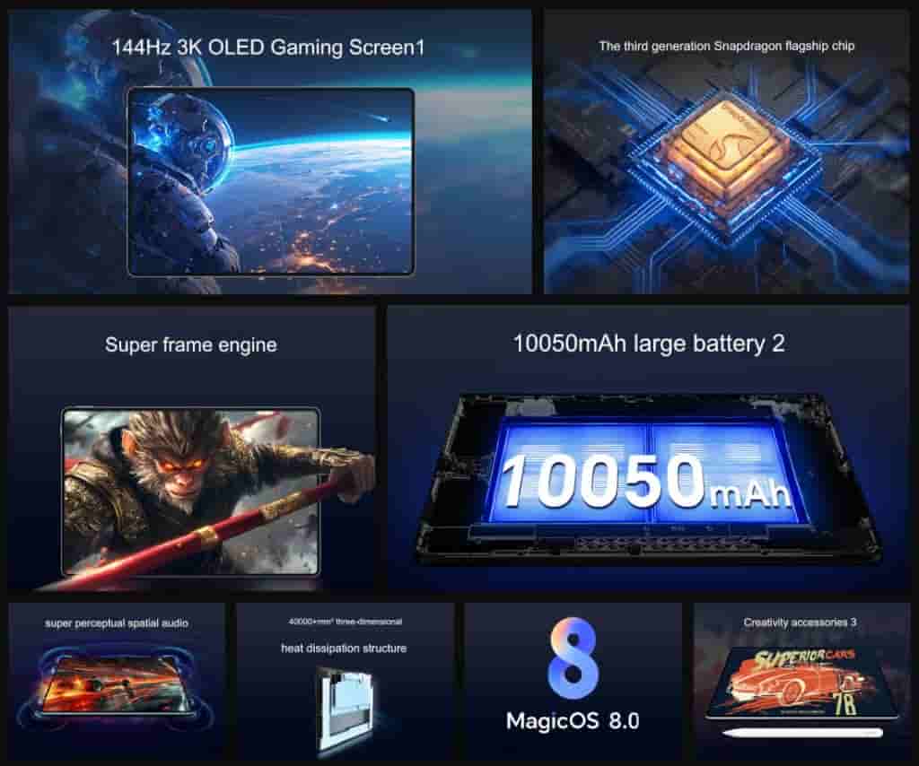 The tablet sports 12.3 inch 3K IMAX Enhanced OLED display that offers 144Hz refresh rate, HDR10 support, up to 1600 nits brightness, UHF 4320Hz PWM dimming, DCI-P3 wide color gamut, and 1.07 billion colors. It is powered by Snapdragon 8s Gen 3 processor paired with 8/12/16GB RAM and 128/256/512GB internal storage. It runs on MagicOS 8.0. The tablet is backed by a 10050mAh battery that supports 66W SuperCharge support.