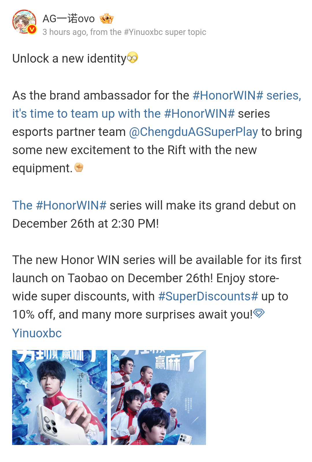 The professional e-sports team from Chengdu, China – AG Super Play will be the brand ambassador for Honor’s Win Series gaming-oriented smartphones, and the teaser posters shared showcases the upcoming Honor Win smartphone (White color variant) along with Yinuo (Xu Bicheng), ZhongYi, ChangSheng, DaShuai, and XuanRan. As earlier revealed, the official debut of the Honor Win Series will be taking place on the 26th of December 2025 at 2:30PM local time and just after the launch happens, the two devices are said to be made available for purchase too in the Chinese market.