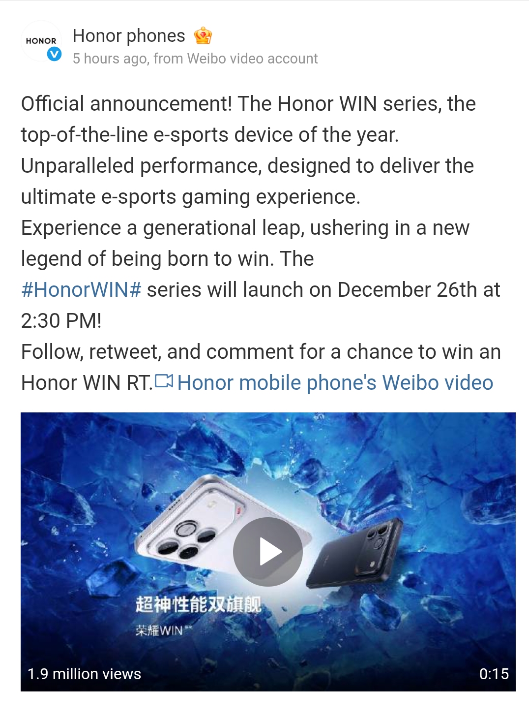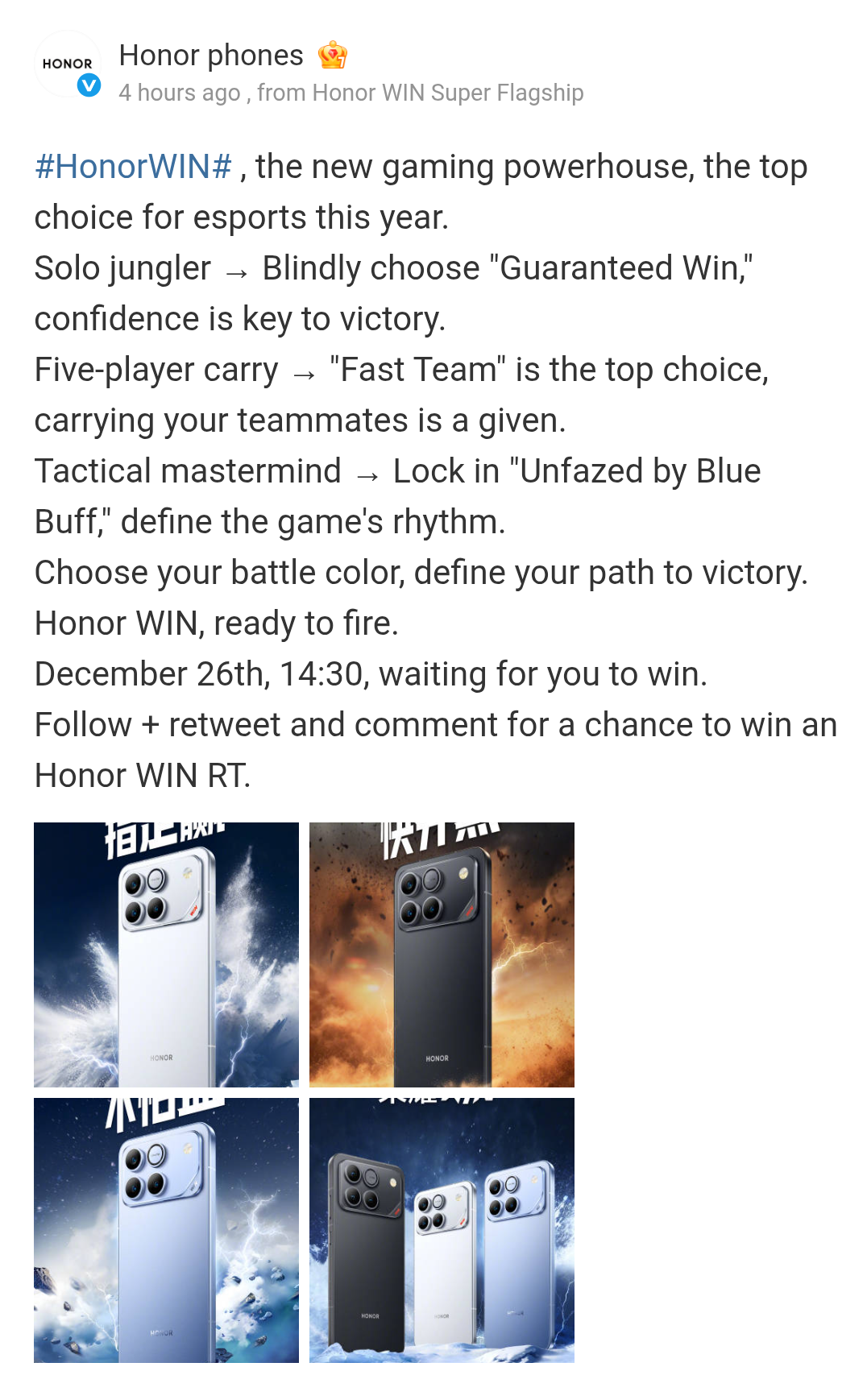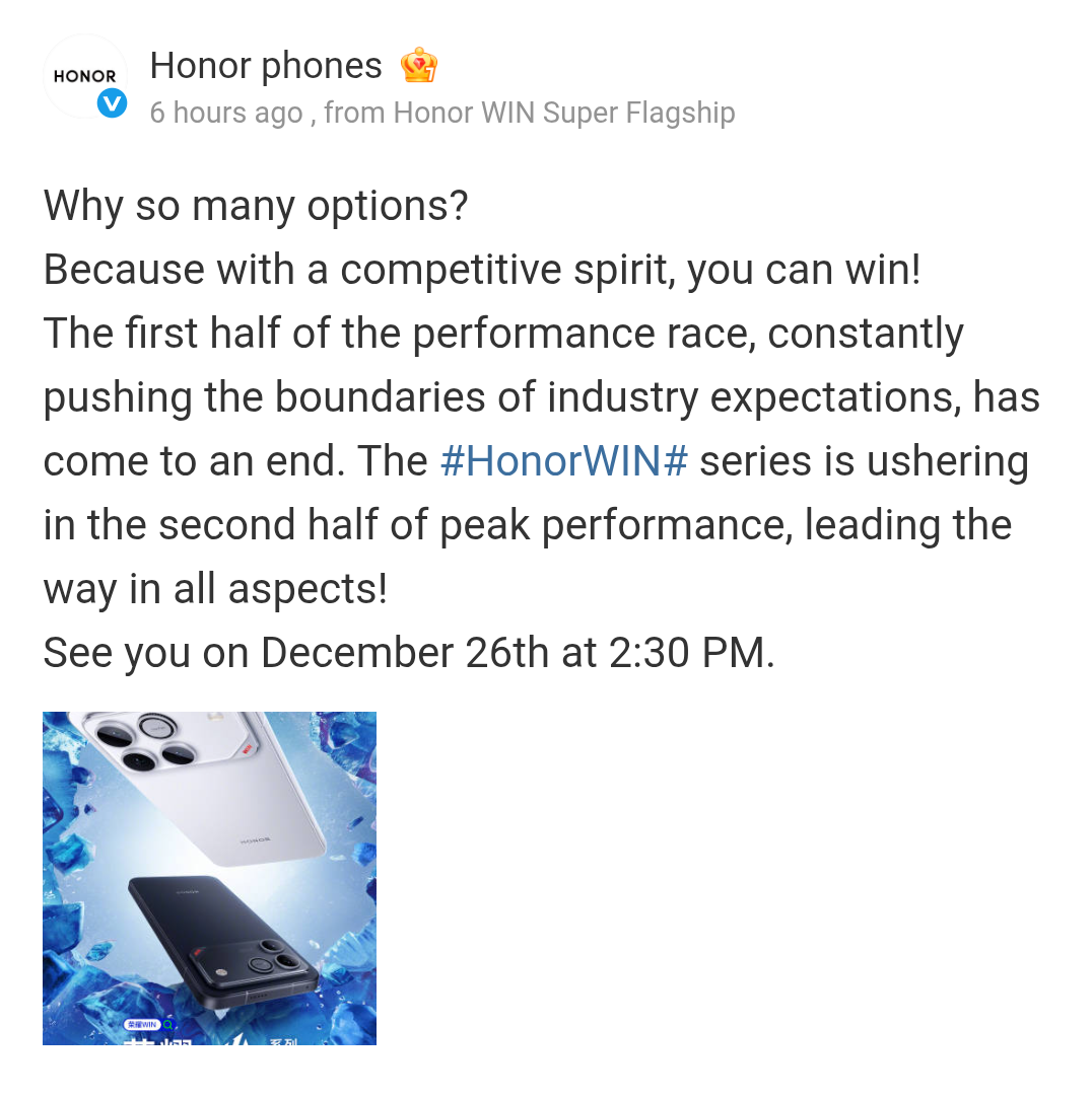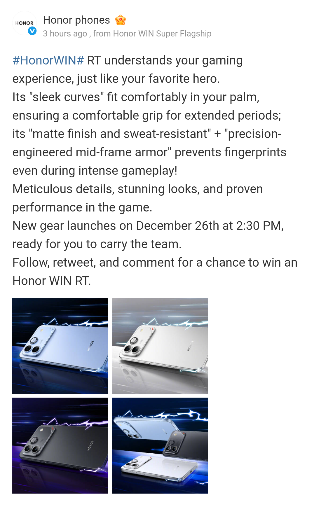 The upcoming Honor Win Series, as earlier revealed, will be introducing two new performance-oriented flagship smartphones, promising top-of-the-line e-sports gaming experience. Under the series, Chinese customers can expect the Honor Win and the Honor Win RT smartphone models, and the two are scheduled to debut on the 26th of December 2025, at 2:30 PM local time.