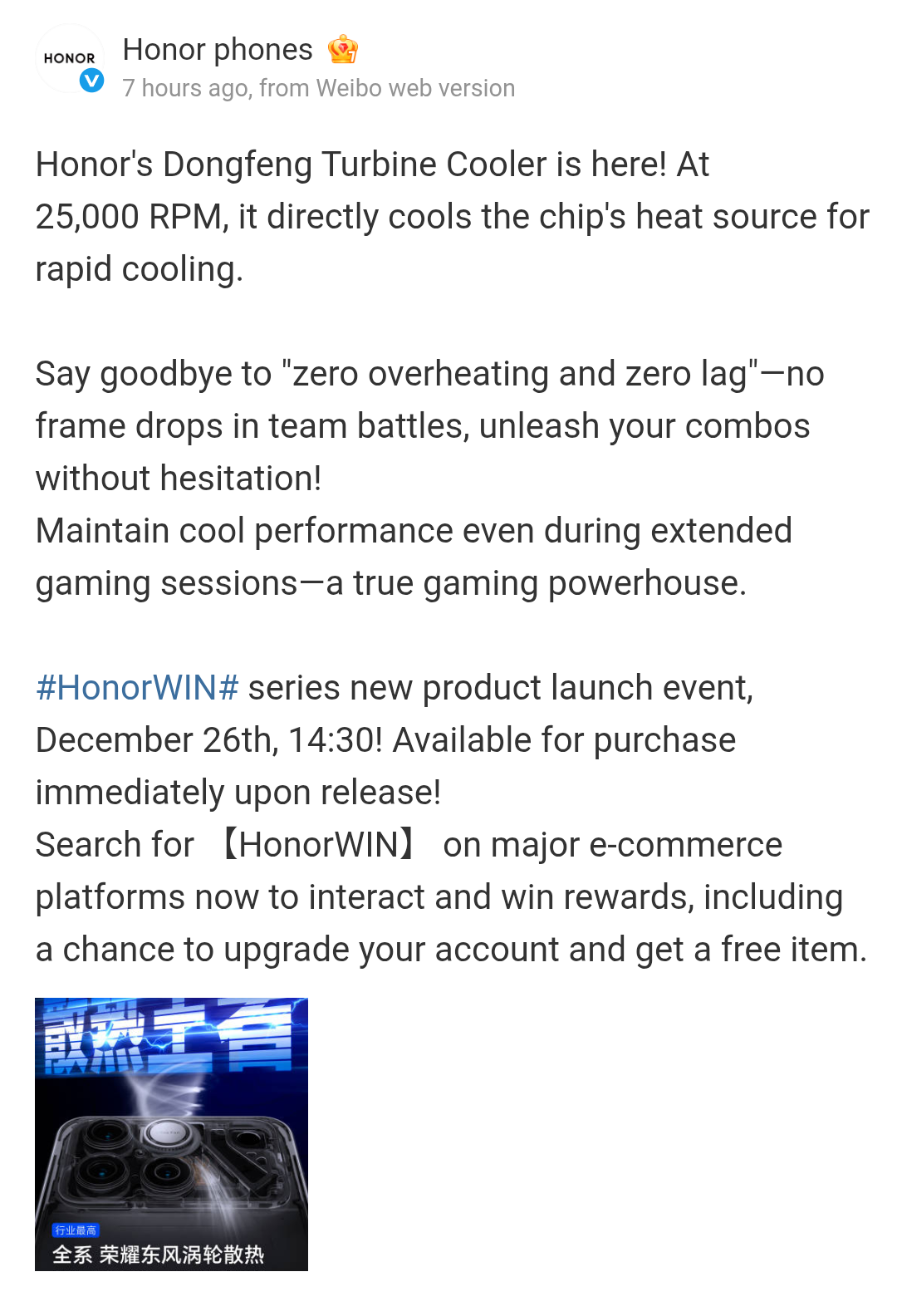 Honor Win Series Officially Teased to Feature the Dongfeng Turbine Cooler With 25,000 RPM Three Days Ahead of its Debut