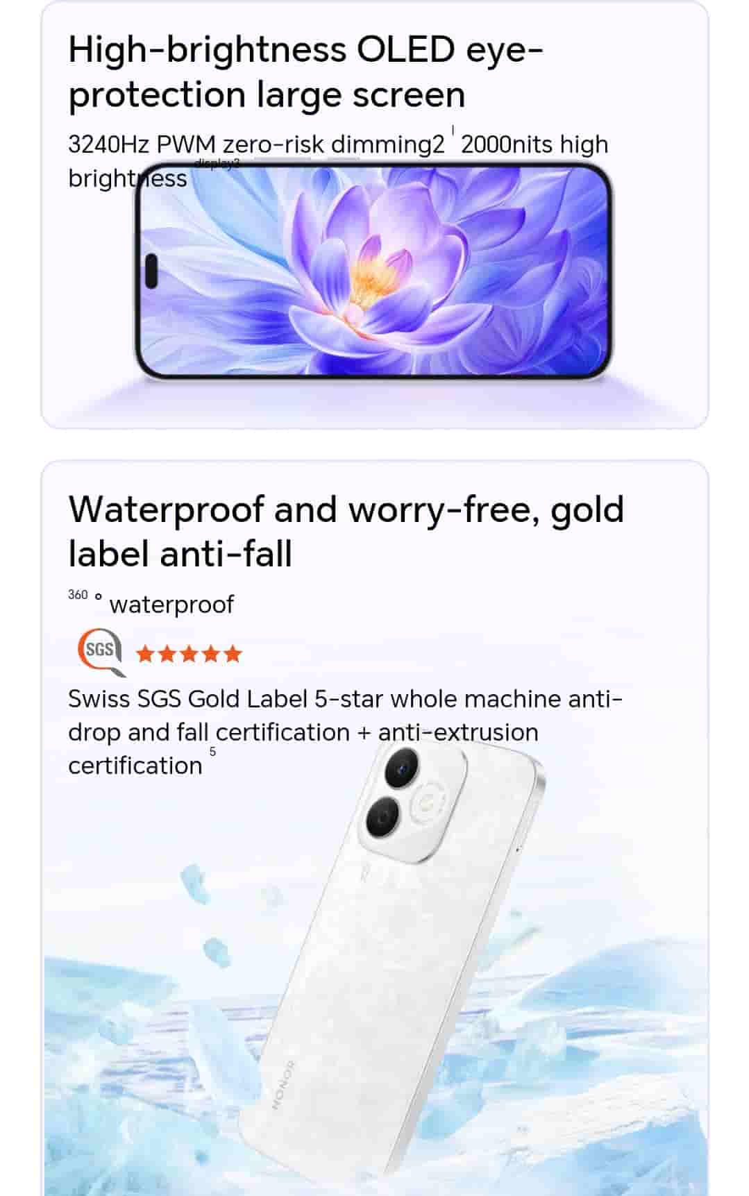 The smartphone features a 6.7-inch AMOLED display that offers up to 90Hz refresh rate, 2412×1080 screen resolution, 3420Hz PWM zero risk dimming, 2000 nits brightness, 16.7 million colors, and a DCI-P3 wide color gamut. It is powered by MediaTek Dimensity 6080 SoC and equipped with Mali-G57 MC2. It runs on Honor MagicOS 8.0 based on Android 14. The device is backed by a 5000mAh battery that supports up to 35W super fast charging.