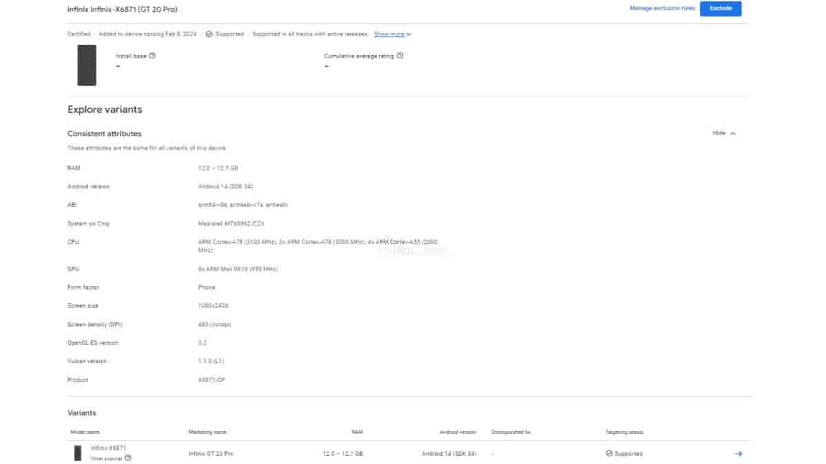 The Infinix GT 20 Pro smartphone bears the model number X6871. As per the listing, the smartphone will come with a MediaTek Dimensity 8200 processor paired with ARM Mali G610 GPU. The processor comes with a Cortex-A78 core (clocked at 3.10GHz), three Cortex-A78 cores (clocked at 3.0GHz), and four Cortex-A55 cores (clocked at 2.0GHz). It will pack 12GB RAM and will run Android 14 out of the box. It also confirms that the smartphone’s display will have 480ppi pixel density and 1080×2436p display resolution.