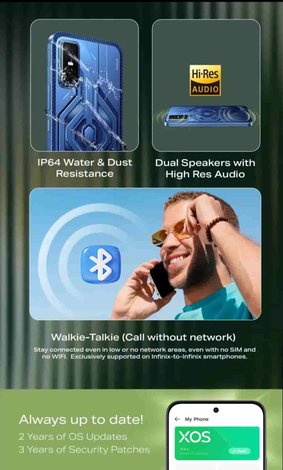 It offers 10+ hours of BGMI, 20+ hours of YouTube streaming, and 12+ hours of Google Maps. The device is equipped with 3D Vapor Chamber Cooling (6 layers of graphite, copper, and stainless steel, 5400mm2 large area), X-Axis Linear Vibration Motor, and 6-Axis gyroscope. It comes with an IP64 water & dust resistance, dual speakers with Hi-Res audio, and calls without network feature (exclusively supported on Infinix-to-Infinix smartphones). The smartphone runs on XOS 15, while the company has promised 2 years of OS updates and 3 years of security updates. It will arrive in Pulse green, Cyber blue, and Blade white color options.