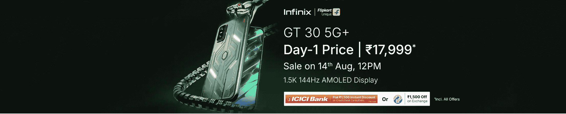 The Infinix GT 30 5G+ will be available in Blade White, Cyber Blue, and Pulse Green. Pricing is set at ₹19,499 for the 8 GB + 128 GB model and ₹20,999 for the 8 GB + 256 GB model via Flipkart and other major retailers. The open sale begins on 14th August 2025, with an additional ₹1,500 discount on day one for ICICI Bank cardholders.