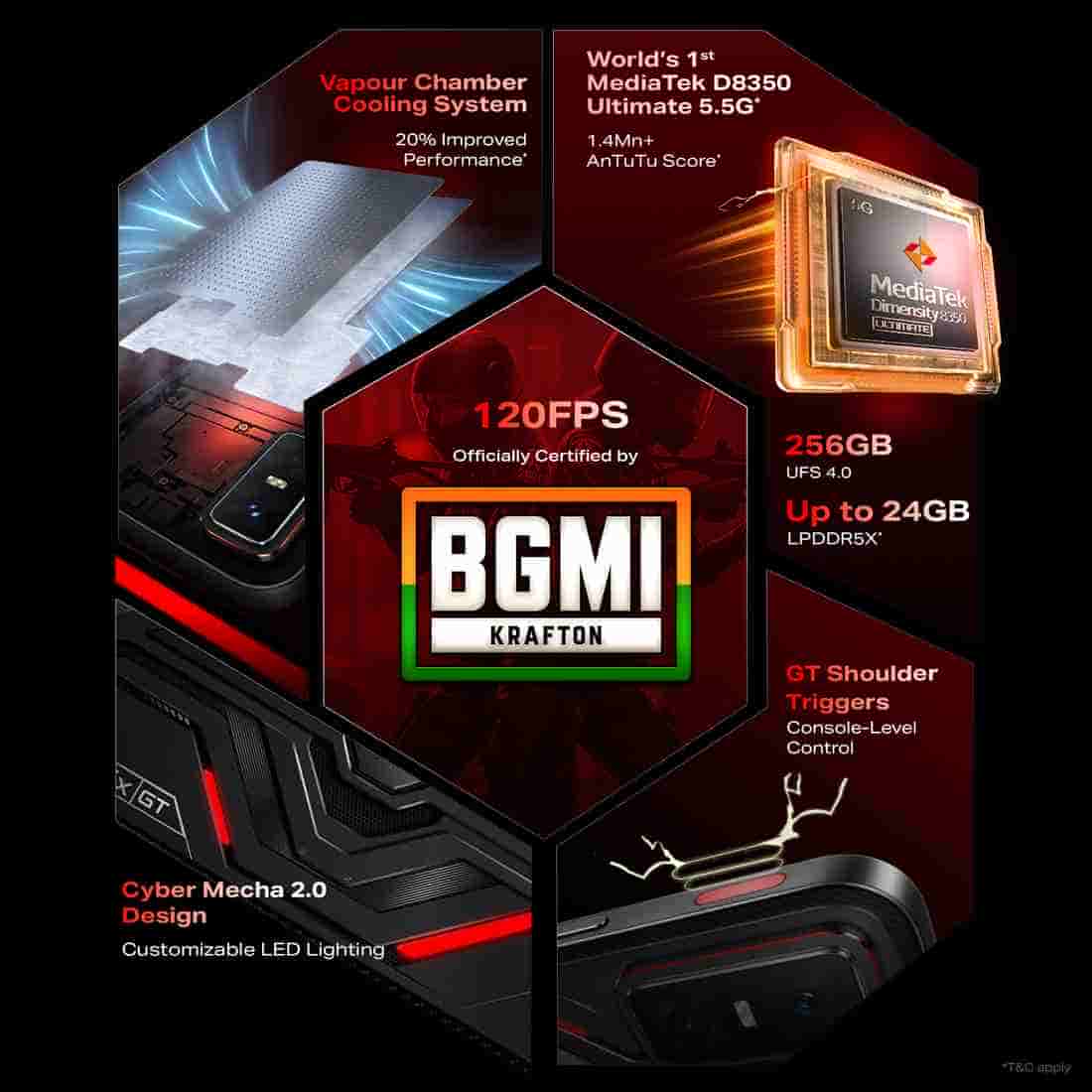 It will be powered by MediaTek Dimensity 8350 Ultimate SoC, which is said to be 2x faster and is paired with Mali-G615 GPU. It arrives with a 15,00,000+ AnTuTu score and offers up to 24GB LPDDR5X RAM and 256GB UFS 4.0 storage. It offers 120 FPS gaming in BGMI. The device is equipped with a 6-layer 3D Vapor Chamber cooling system and will come with XBoost AI Game Mode.