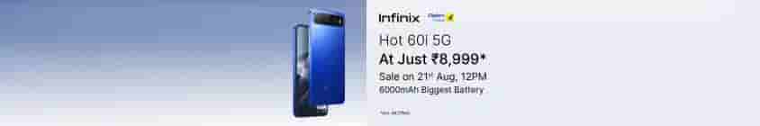 The Infinix HOT 60i 5G has been launched in a single memory option of 4GB RAM with 128GB storage. It comes in four colour options, Monsoon Green, Plum Red, Shadow Blue, and Sleek Black, and is priced at ₹9,299. With bank offers, you can get it for ₹8,999. Sales will officially begin on 21st August 2025 via Flipkart and other major retailers.