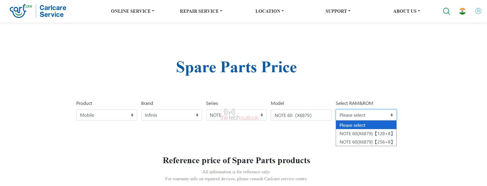 On the Carlcare website, the infinix Note 60 (X6879) is listed with two memory options of 8GB/128GB and 8GB/256GB, the Note 60 Pro (X6878) is listed with 8GB/128GB, 8GB/256GB, and 12GB/256GB, and the Note 60 Ultra with 12GB/256GB and 12GB/512GB.
