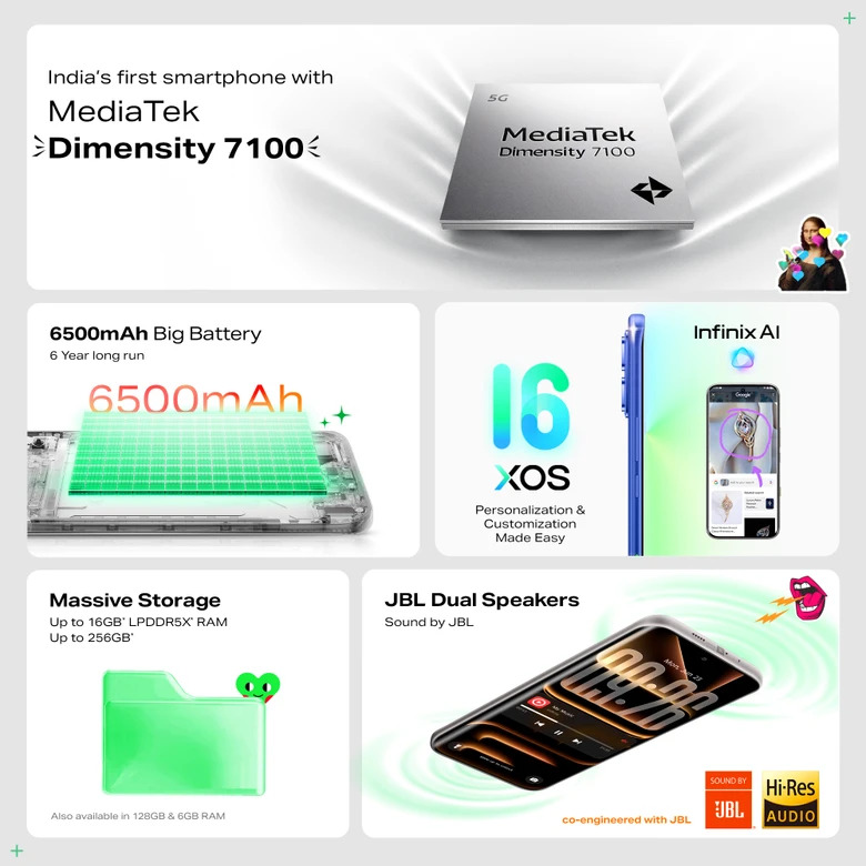 Although launched, its open sales will begin on 25th Feb at 12 PM, and it is currently available for pre-booking via the Infinix India website and Flipkart in three colour options: Stellar Blue, Lunar Titanium, and Silk Green. And regarding its pricing, the 6GB/128GB variant is priced at ₹21,999, the 8GB/128GB variant is priced at ₹23,999, and the 8GB/256GB variant is priced at ₹25,999.