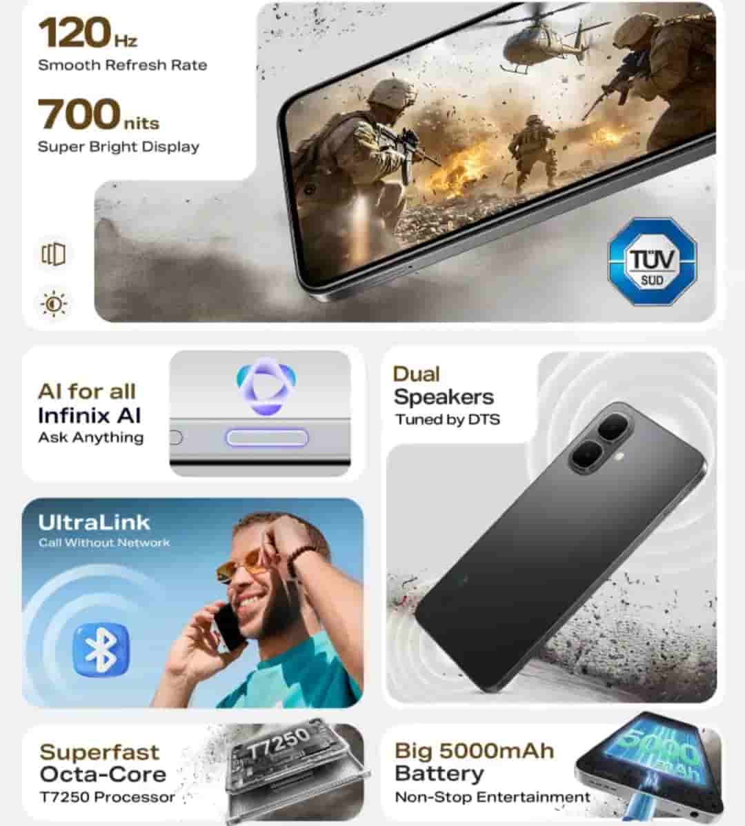 The device will feature a scratch-resistant back panel. The device has gone through 25,000+ repeated drop tests and 1.5m 6-sided drop tests. It comes with an IP64 water and dust resistance. It features a 6.67-inch punch-hole display that offers a 120Hz refresh rate and 700 nits of brightness. It is equipped with dual speakers that offer 300% more volume. With one-tap Infinix AI, you can access a writing assistant, a document assistant, and Folax AI personal assistant.