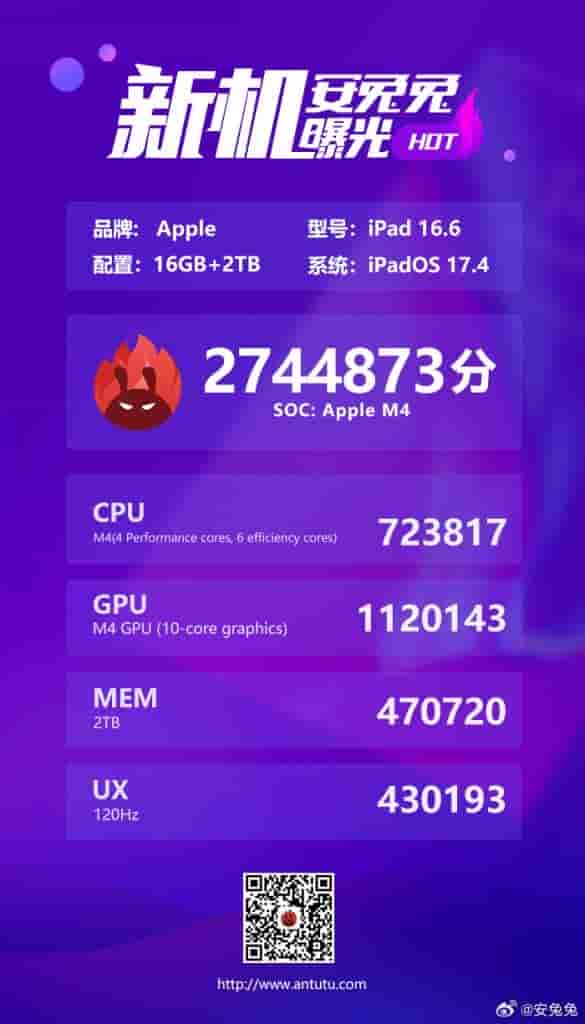 Cupertino-based tech giant Apple just recently launched the Apple iPad Pro during the launch event along with other products. The tablet came with the M4 chip from Apple. This new iPad Pro has broken all the records with the exceptional AnTuTu benchmark score. Recently a post appeared on Weibo from the AnTuTu official account that shows the benchmarking result of an Apple device with the model number iPad 16.6. It runs iPadOS 17.4 and packs 16GB RAM with 2TB storage. This is believed to be the newly launched iPad Pro 2024. Let’s get to know about the scores in detail.
