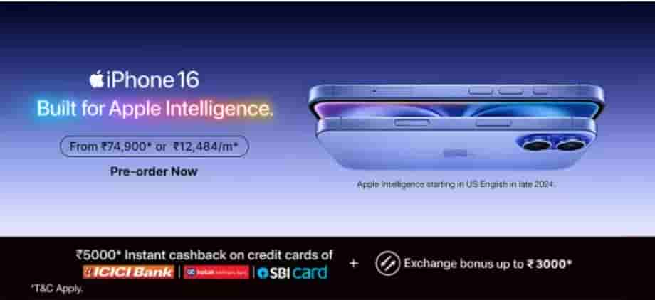 The Apple iPhone 16 series is available for pre-orders on Amazon and Flipkart’s official websites. On pre-ordering iPhone 16 or iPhone 16 Plus model buyers can avail of Rs.5000 instant cashback on credit card transactions of ICICI bank, Kotak, and SBI, Rs.3000 exchange bonus, and Rs.12,484 per month EMI option.