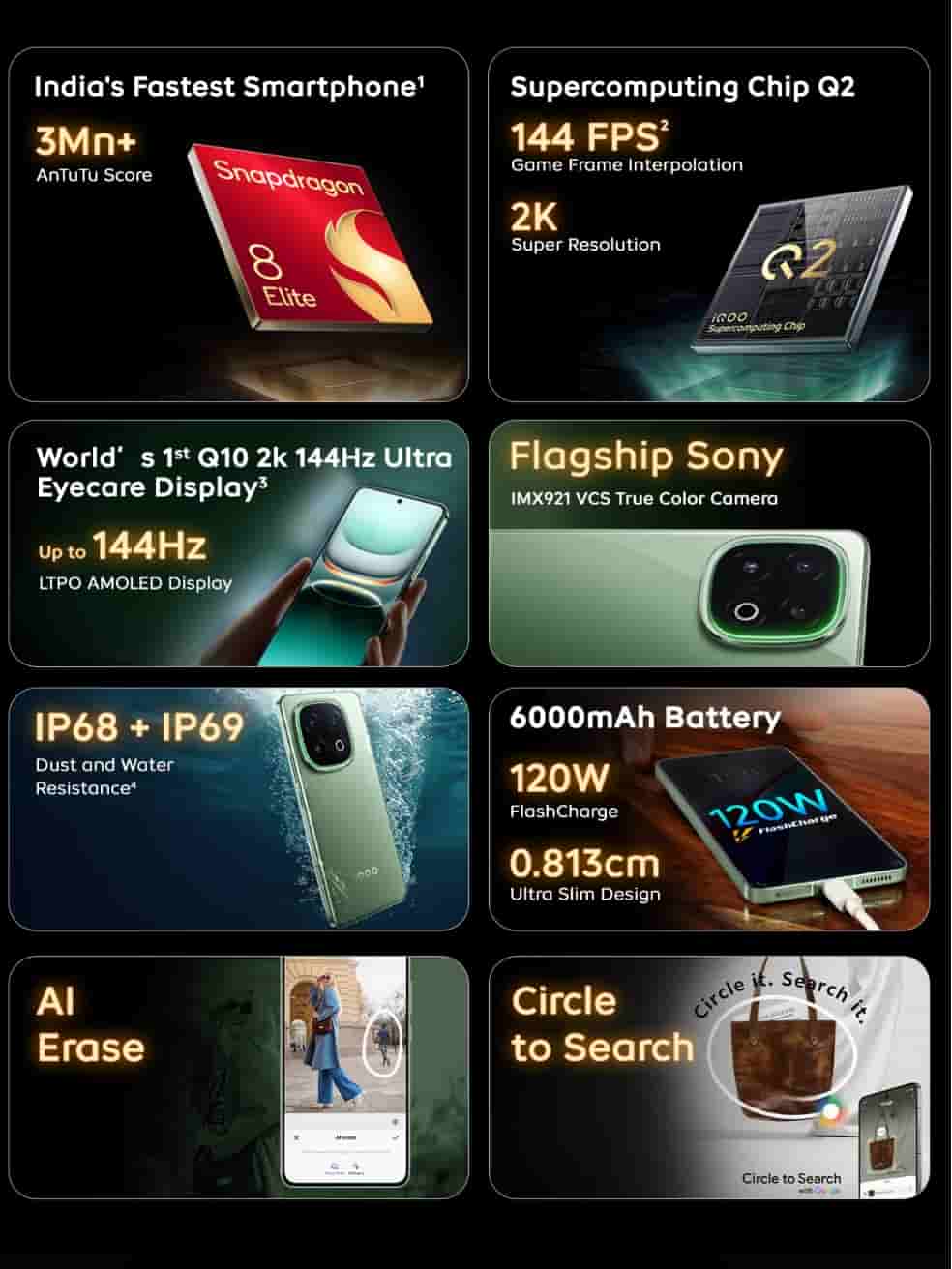 The device is backed by a 6000 mAh battery and comes with support for 120W flash charging. It can be charged up to 40% in 10 minutes, and in 30 minutes the smartphone will be fully charged. It runs on Funtouch OS 15, and the company has promised 4 years of Android updates and 5 years of security updates. Other features include- a 3D ultrasonic fingerprint sensor, multi-finger operations, tempered glass screen protection, circular polarization technology, dedicated Q2 chip, USB 3.2, 7K Ultra VC Cooling system, Monster halo light with 72 options, Bypass charging support, Adreno Motion Engine 2.0, IP68+IP69 rating, and various AI features.