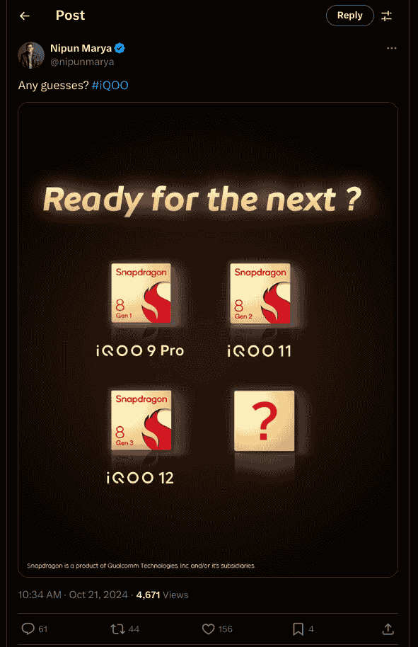 This update has been officially shared by iQOO India CEO – Nipun Marya, and he in his X/Twitter post has teased the next iQOO smartphone that will be arriving in the Indian market following the iQOO 9 Pro(Snapdragon 8 Gen 1), iQOO 11(Snapdragon 8 Gen 2), and iQOO 12(Snapdragon 8 Gen 3) flagships. With the hints given, the next iQOO smartphone will be the iQOO 13 device which is expected to be powered by Qualcomm’s latest Snapdragon 8 Elite chipset. It is possible that an official confirmation regarding the launch date may be shared soon after the China debut this month, or likely around the same time.