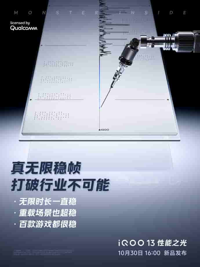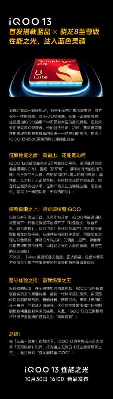 iQOO 13 is said to offer a true unlimited frame rate- Stable for an unlimited time, super stable even in heavily loaded scenes and hundreds of games are stable. This upcoming smartphone will be powered by the all-new Snapdragon 8 Elite chipset. It is said to be the first device equipped with Blue Crystal and Snapdragon 8 Elite chipset.