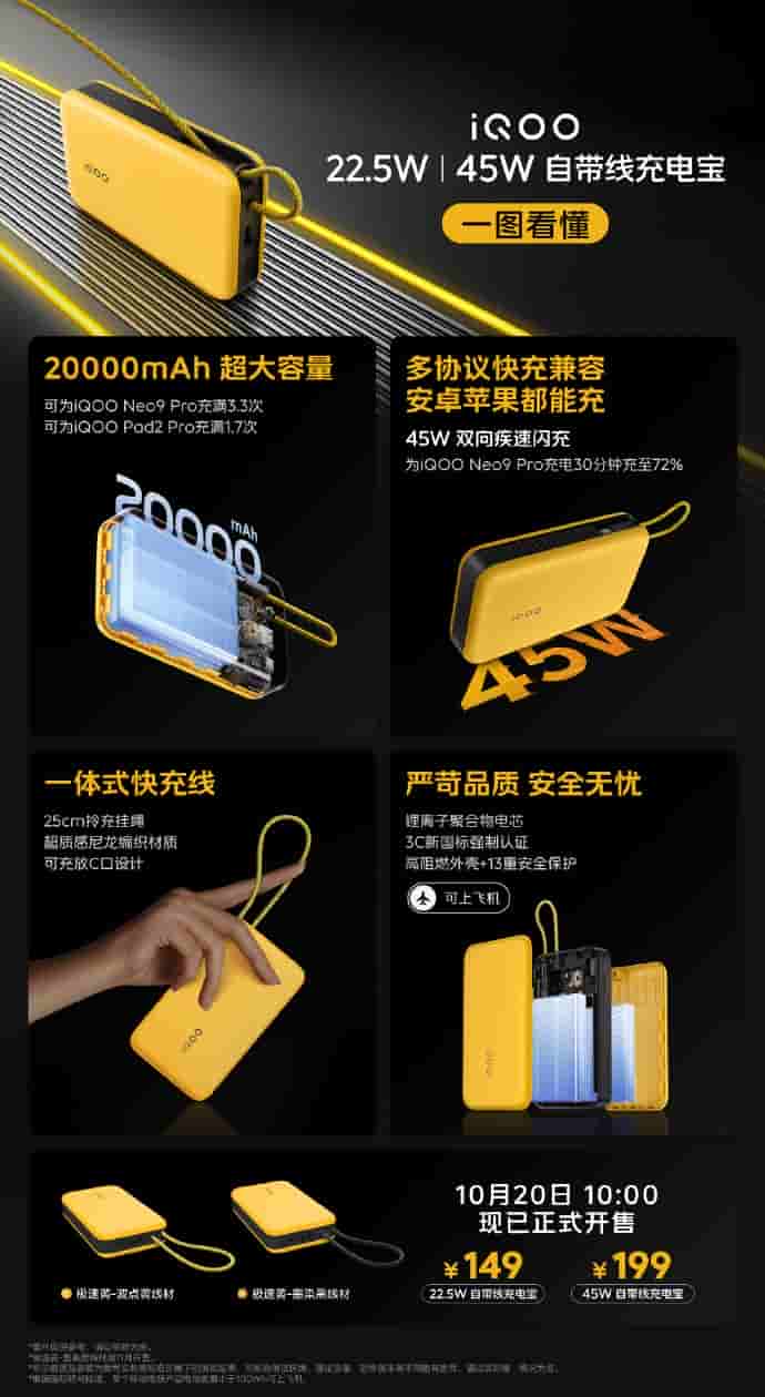 The power banks are equipped with a 20000 mAh lithium-ion polymer battery. They can fully charge the iQOO Neo 9 Pro 3.3 times and the iQOO Pad 2 Pro 1.7 times. They arrive with multi-protocol charging compatible and can charge both Android and Apple devices. They are integrated with a fast charging cable, a 25cm charging lanyard, super textured nylon braided material, and a C-port design for charging. They are 3C New National Standard Compulsory certified. They arrive with a high flame retardant shell and 13 layers of safety protection.