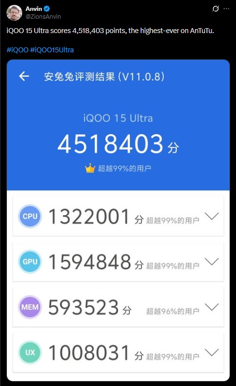 iQOO 15 Ultra appears on AnTuTu with record 4,518,403 score; teaser confirms “Monster Touch” shoulder buttons