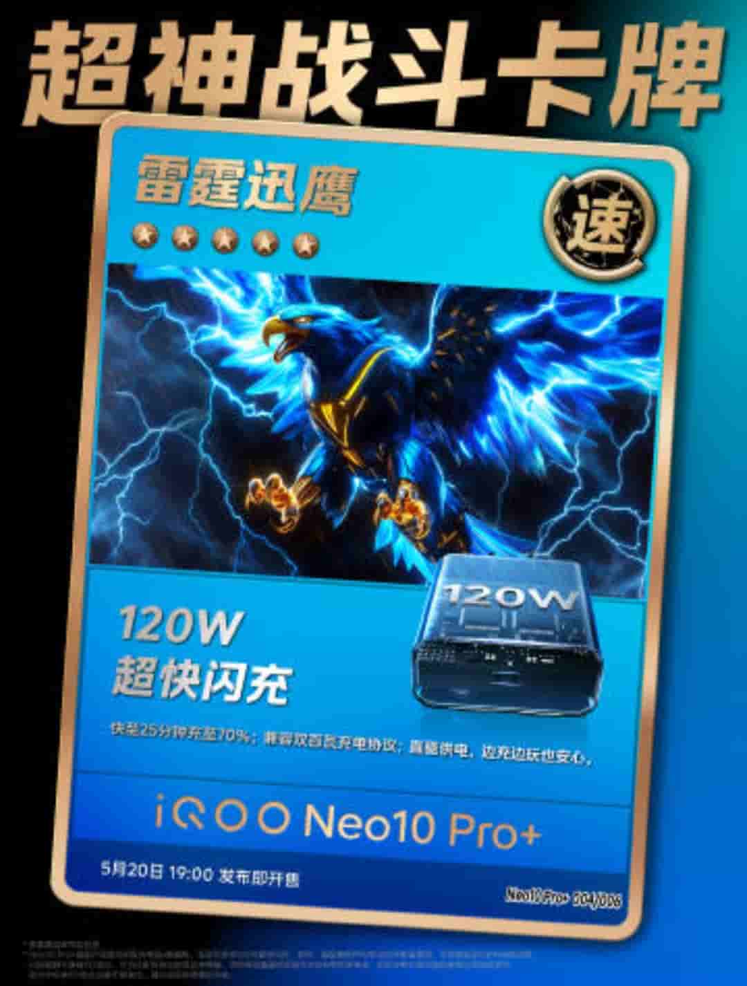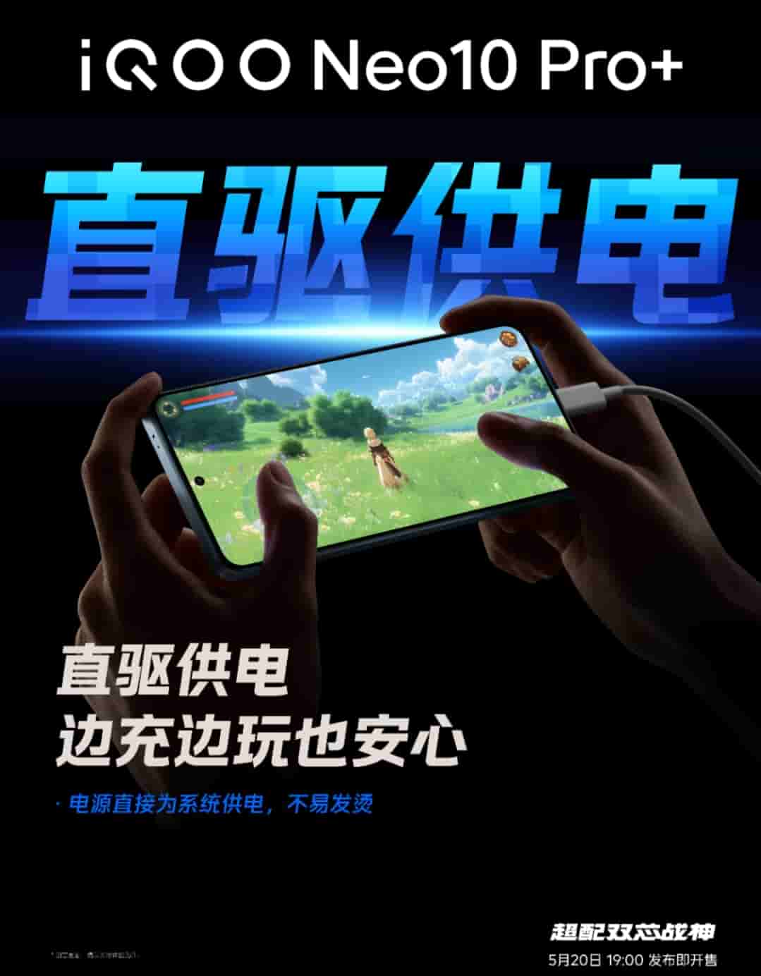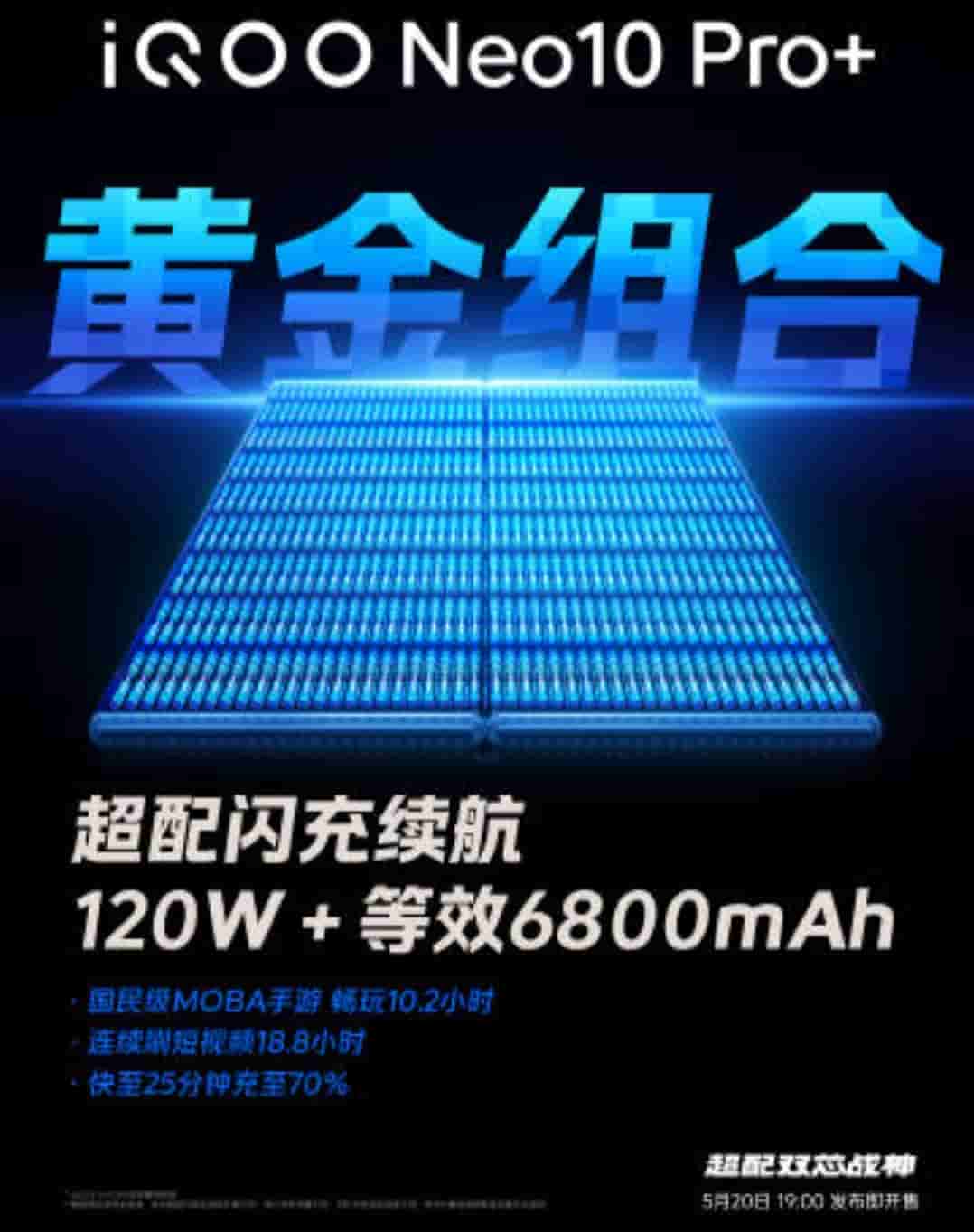 iQOO Neo 10 Pro+ will be equipped with a 6800 mAh battery and support 120W fast charging. The device supports dual 100W charging protocol- up to 100W PPS protocol (smartphone) and up to 100W PD protocol (flash charging kit). Direct drive power supply allows users to play while charging the device. Users can charge the device up to 70% in 25 minutes.
