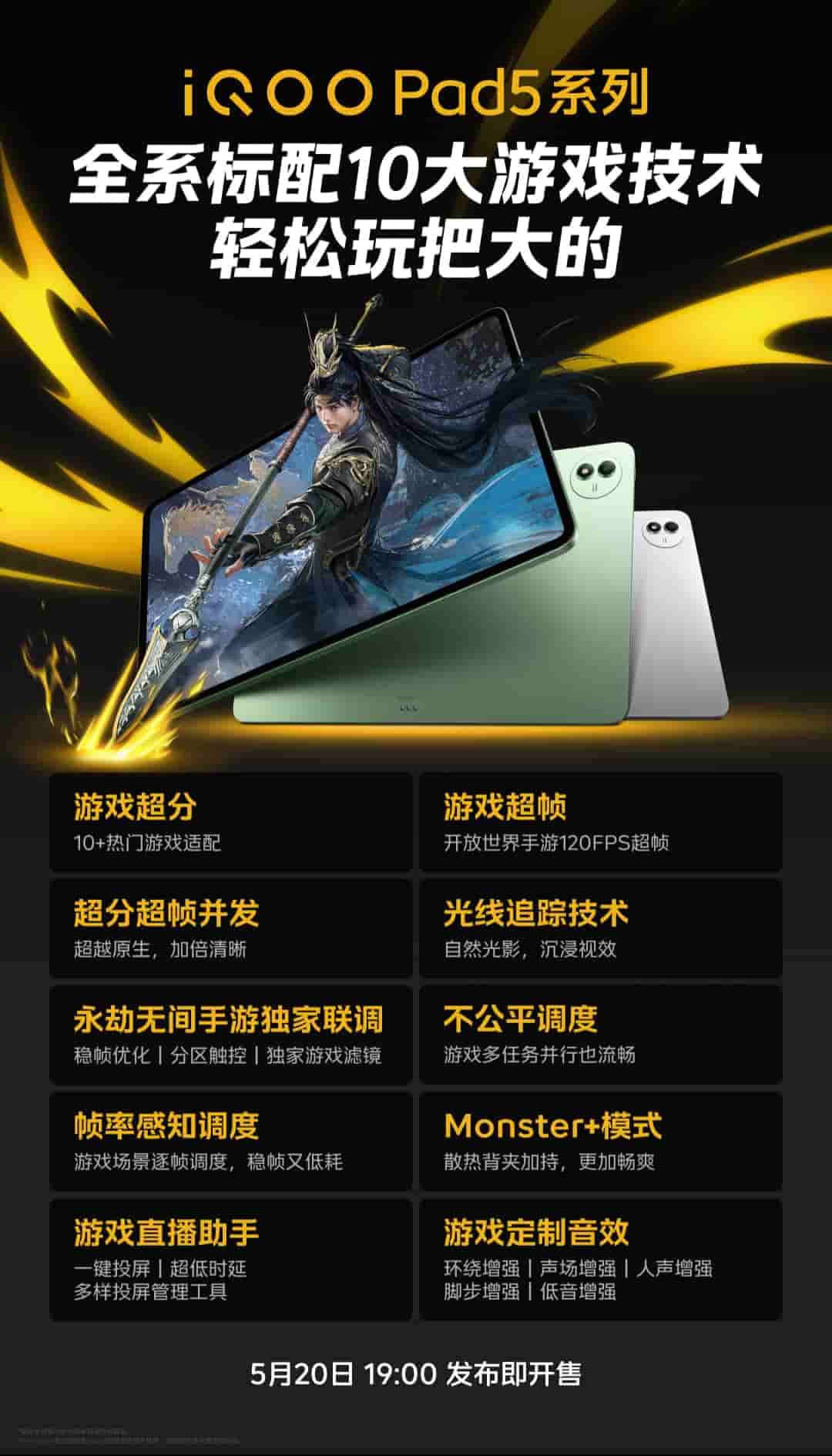 The entire iQOO Pad 5 series is equipped with 10 major gaming technologies- game overscore, game super frame, super framing concurrency, ray tracing technology, exclusive joint debugging of Naraka: Bladepoint Mobile, unfair scheduling, frame rate aware scheduling, Monster+ mode, game custom sound effects, and game live assistant.