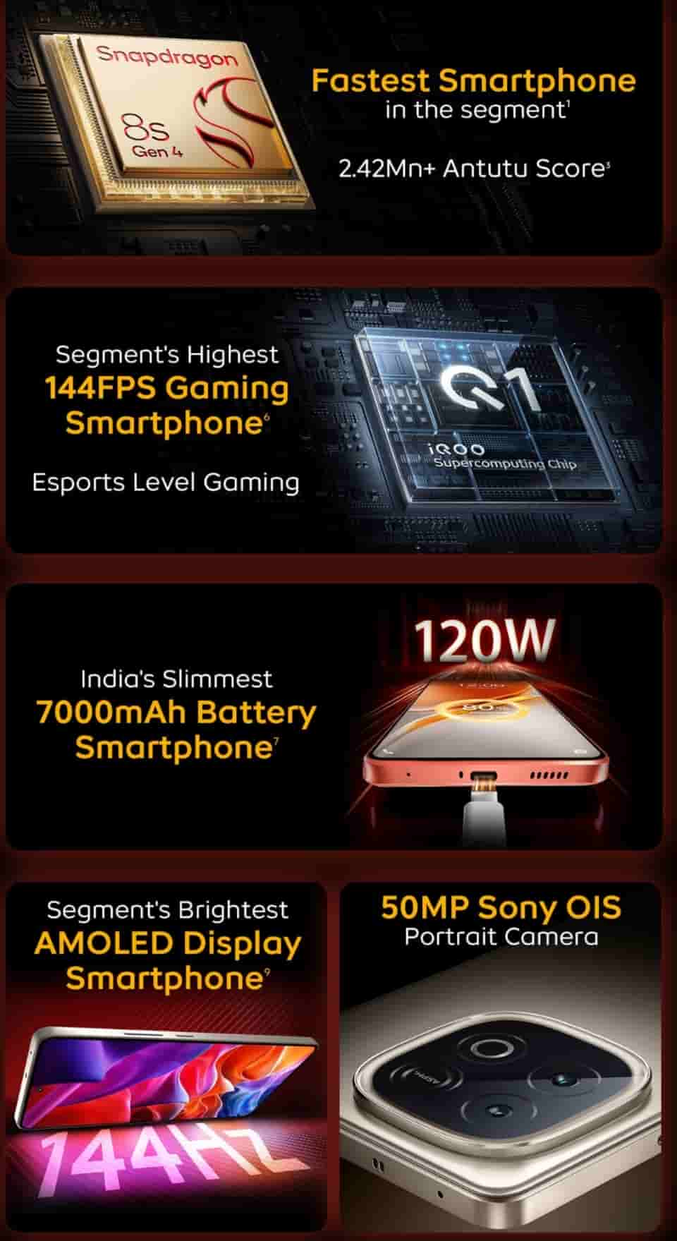 Other features include- NFC, IR Blaster, WiFi 7, 16 5G Bands, Night vision mode, Bypass charging, in-built FPS meter, massive 7000mm2 vapor cooling chamber, flagship AI features, 144FPS gaming, iQOO Q1 Supercomputing chip, dual SIM, in-display fingerprint sensor, stereo speakers, up to 4K 60fps video recording, IP65 rating and Bluetooth 5.4.