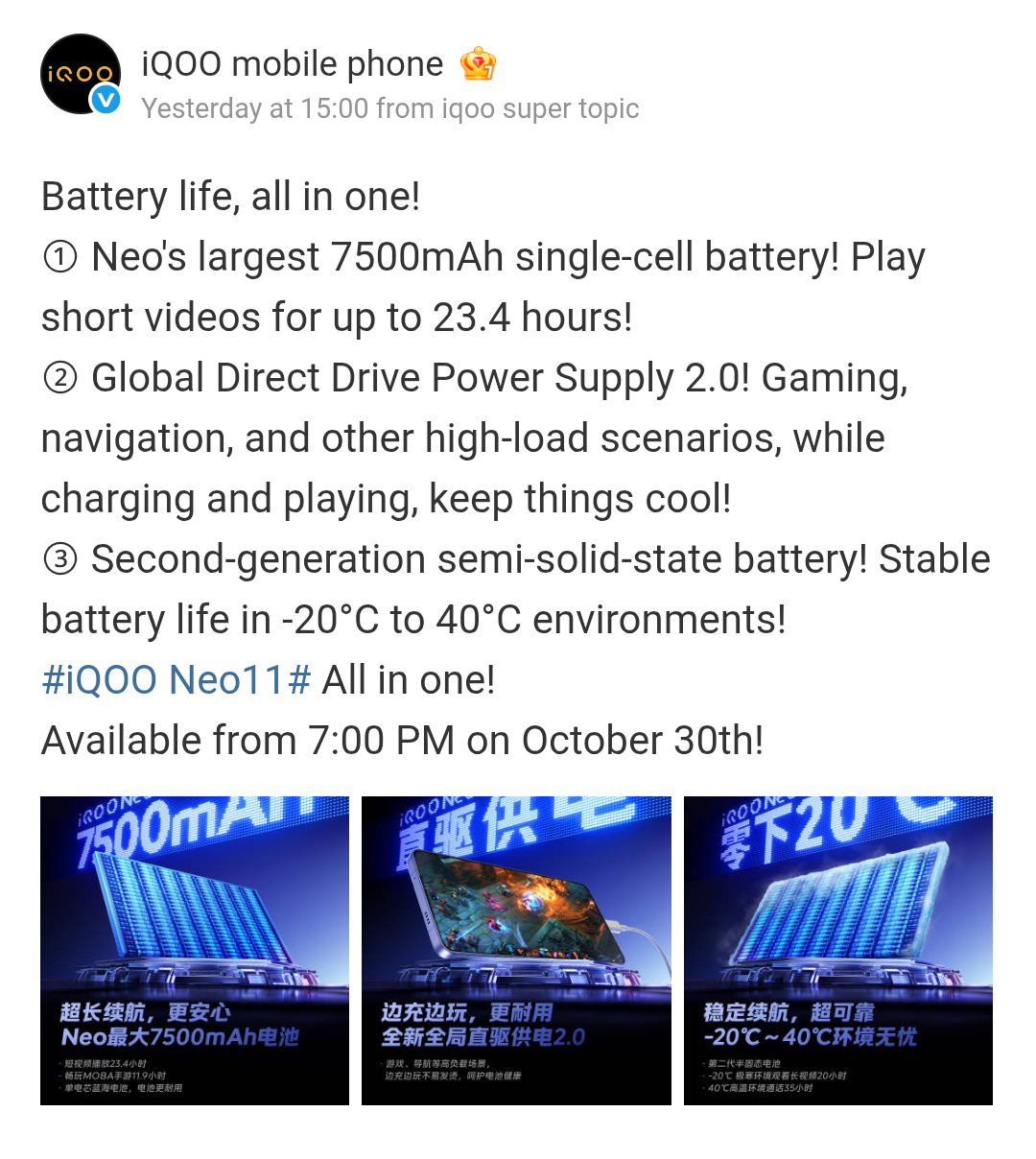 Coming to its teased battery and charging specs, a 7500 mAh single-cell battery will be packed within the device, and this is said to be the largest battery backup that is being offered on a Neo lineup. Also, short videos can be played for up to 23.4 hours, and a stable battery life is assured in -20° C to 40° C temperature range (thanks to the second-generation semi-solid-state battery). Additionally, the Global Direct Drive Power Supply 2.0 technology has also been teased for the device, enabling users to charge the device directly (bypass charging) when gaming or while performing high-performance tasks without causing any heating issues.