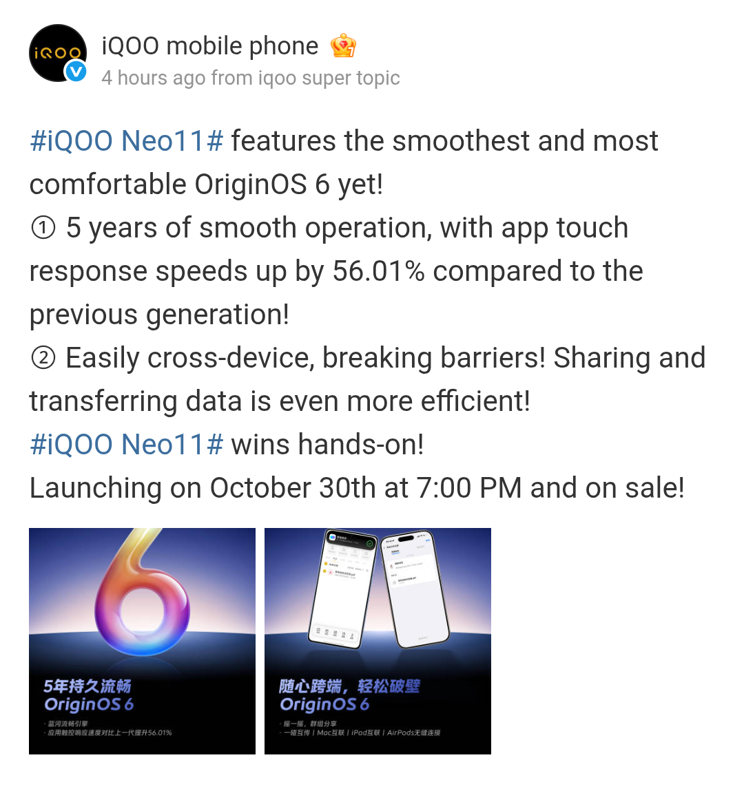 As per the newly-shared teasers, the iQOO Neo 11 will be featuring the Android 16-based OriginOS 6 custom skin, and it will be offering a smooth and comfortable user experience. Moreover, 5 years of smooth operation has also been claimed on the device and in comparison to its predecessor, the app touch response speed has been improved by 56.01%. Seamless cross-device connectivity has also been revealed as a notable aspect of this latest smartphone, and its users will be able to share and transfer data much more efficiently. One-touch transfer, Mac connectivity, iPhone connectivity, and AirPods connectivity have been pointed out.
