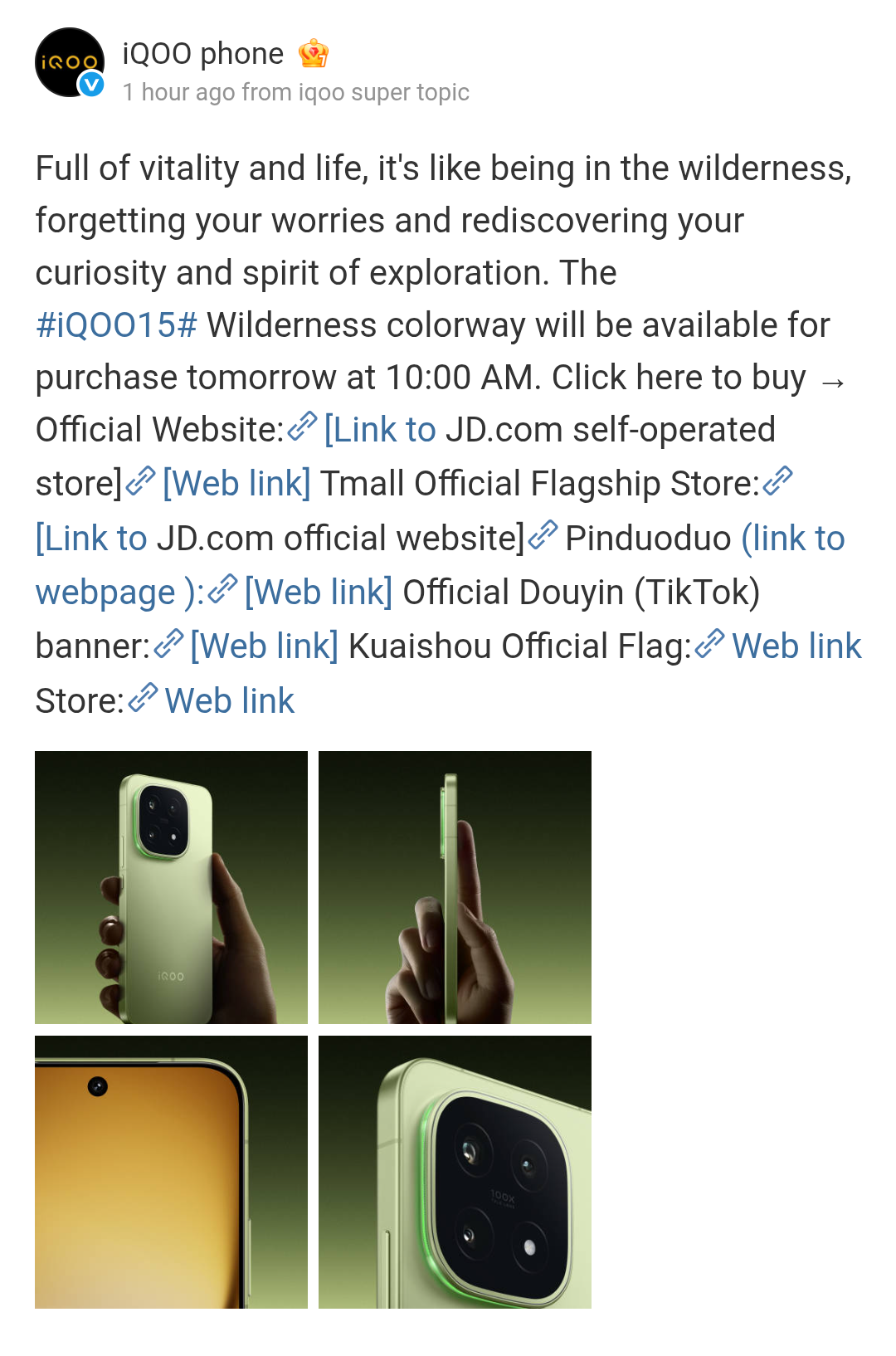 In related news, the Wilderness Edition colorway of the iQOO 15 smartphone will be put up for sale tomorrow on the 31st of October 2025 in China, at 10:00 AM local time. The brand has again shared follow-up teasers regarding it, and design aspects have also been pointed out.