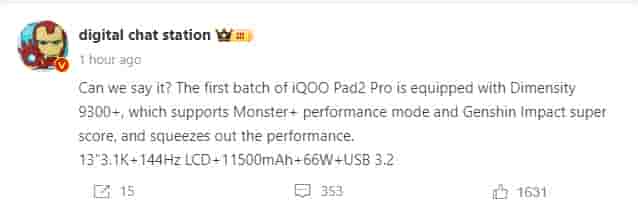 This new information comes in from the reliable tipster DCS, who wrote on Weibo that the iQOO Pad 2 Pro Dimensity 9300+ and as per him this tablet is going to be a powerhouse. He further said it would provide a better performance while playing Genshin Impact.