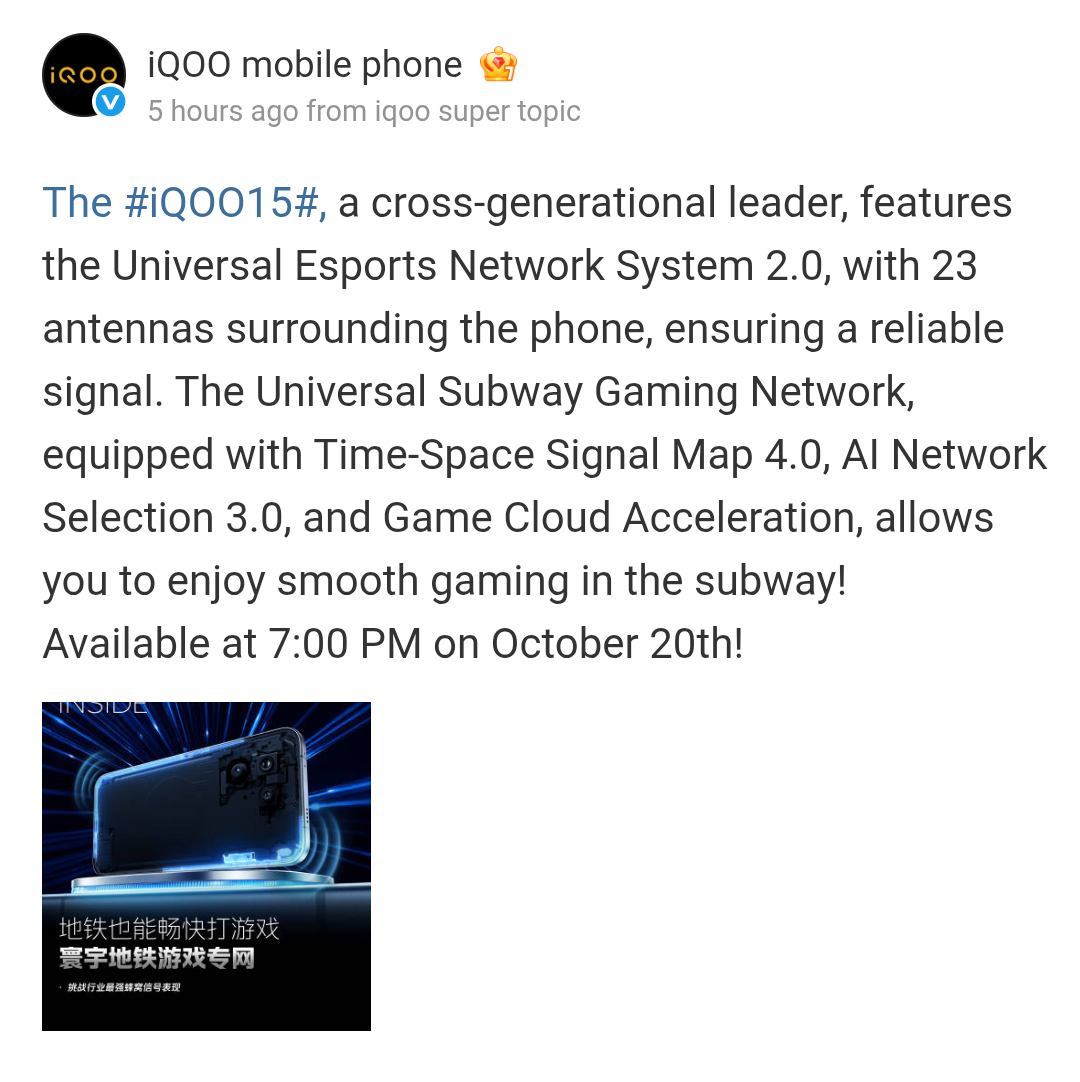 Regarding the iQOO 15 flagship smartphone, it will be equipped with the brand’s largest ever 8K VC Dome cooling system (14% increased heat dissipation area). Additionally, a double layer of ultra-high thermal conductivity graphite material has also been used, and the flagship’s cooling performance has been improved by 47% when compared to its predecessor. On the connectivity side, the iQOO 15 smartphone is teased as a ‘cross-generational leader’ that features the Universal E-sports Network System 2.0 and Universal Subway Gaming Network. With the Universal E-sports Network System 2.0, the 23 antennas that are given ensure reliable signal strengths. The Time-Space Signal Map 4.0, AI Network Selection 3.0, and Game Cloud Acceleration are also equipped as part of the Universal Subway Gaming Network.