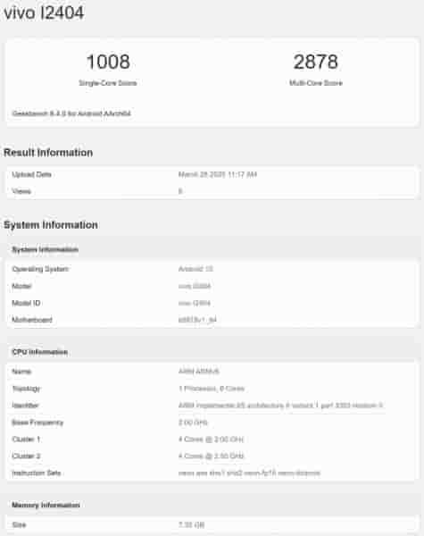 The device received a 1,008 single-core score and 2878 multi-core score. It is revealed to be powered by an octa-core processor with 4 cores clocked at 2GHz and 4 cores clocked at 2.5GHz, which could be a Dimensity 7300 SoC. Other features revealed- G615 MC2 GPU, 8GB RAM, and Android 15 OS.