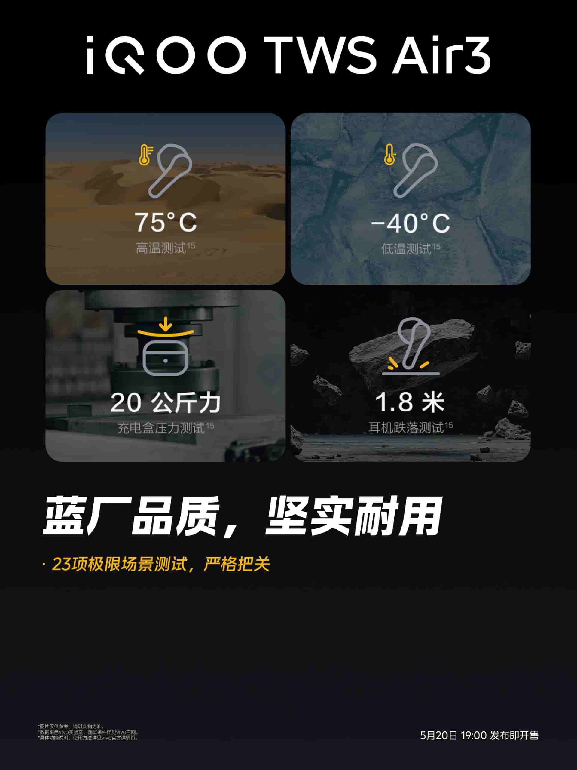 Coming to the iQOO TWS Air 3, its durable build quality has been teased. It adopts five reliability test standards and covers 23 rigorous tests (some of which are the 75°C high temperature test, -40°C low temperature test, 20Kg force charging box pressure test, and the 1.8m headphone drop test). Thus, iQOO TWS Air 3 assures better and durable build quality.