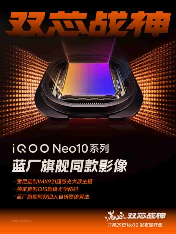 Coming to the teased camera specs, Sony IMX921 super-sensitive outsole main camera, exclusive customized OIS super optical image stabilization, and four self-developing imaging algorithms are also going to be offered in the Neo 10 series smartphones of iQOO.