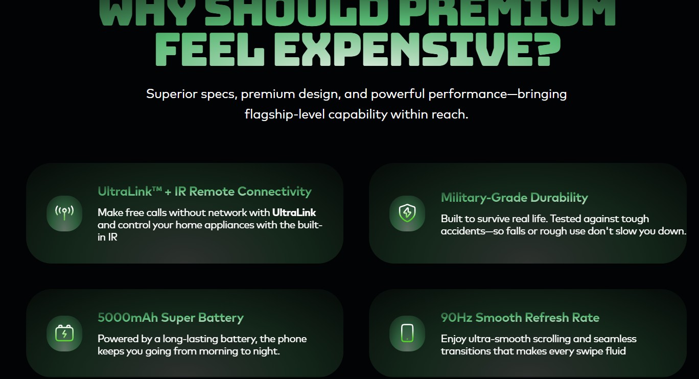Users can make free calls without a network with the help of UltraLink and control home appliances with the built-in IR Blaster. It boasts military-grade durability. The smartphone is backed by a 5000mAh battery and offers a 90Hz smooth refresh rate.