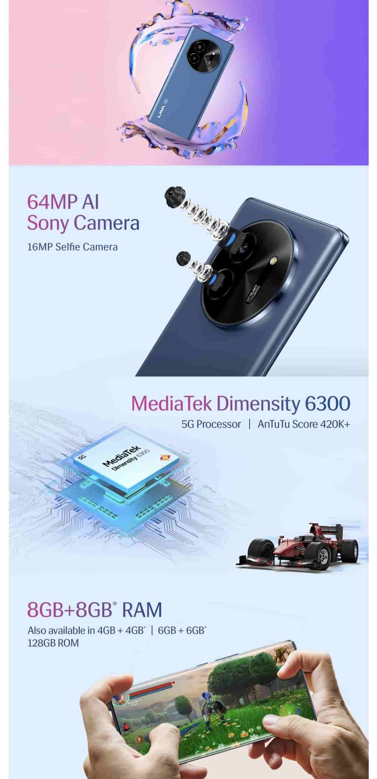 The device sports a 6.67-inch 3D Curved AMOLED display that offers a 120Hz refresh rate. It is powered by MediaTek Dimensity 6300 SoC and arrives with 420K+ AnTuTu score. The chipset is paired with 4/6/8GB RAM and 128GB storage. It also offers up to 8GB virtual RAM. The smartphone runs on Android 14 with no bloatware, ads, and unwanted apps, while the company has promised 1 OS upgrade and 2 years of security patches.