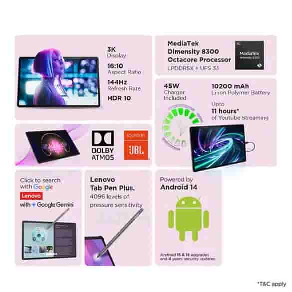 Users can opt for the Circle to Search feature to get info about a particular video content, text, or image. It also includes Google Gemini AI assistant. With the help of Lenovo Smart Connect users can effortlessly share files, navigate seamlessly, take Android apps to PC, and copy and paste across devices. The tablet features an all-metal back with a subtle top-patterned design. It measures 291.8×189.1×6.9mm (without a camera bump) and weighs about 615g.