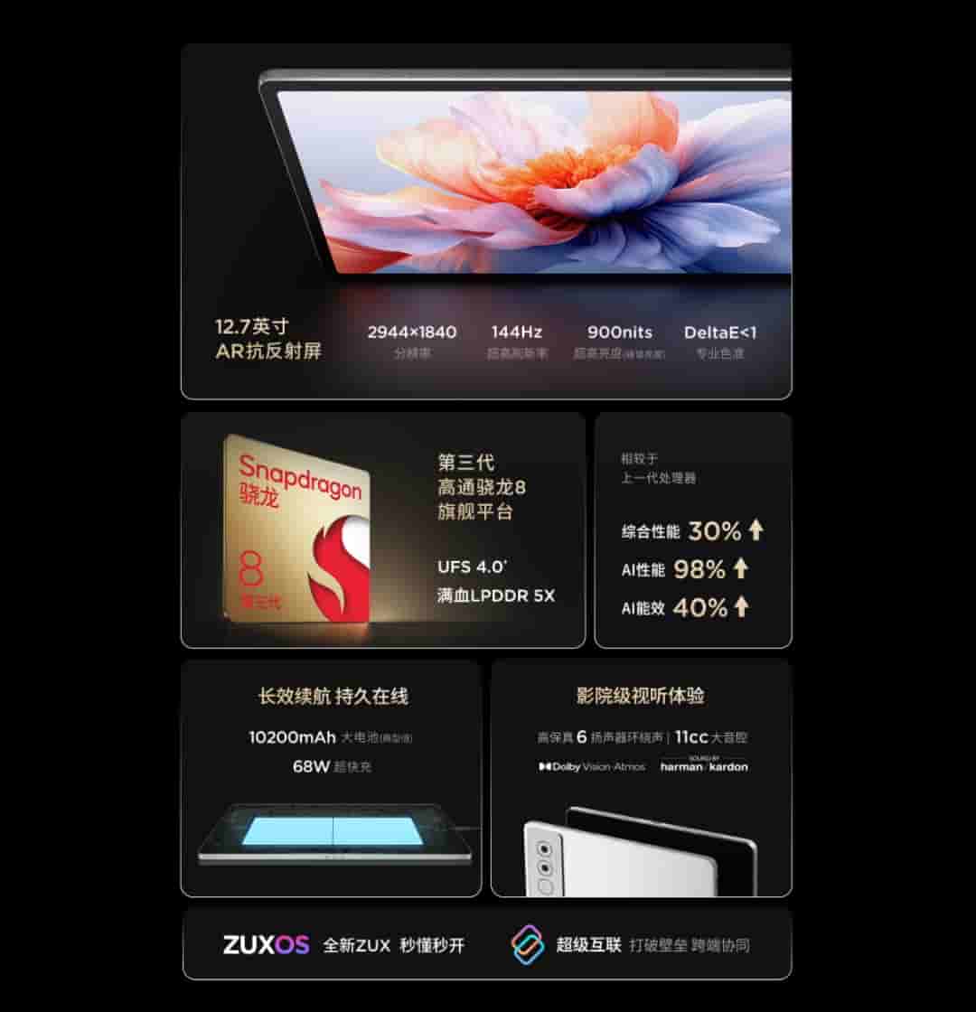 The tablet sports a 12.7-inch display with a 144Hz refresh rate and 900 nits peak brightness. It is powered by Snapdragon 8 Gen 3 SoC that is paired with up to 16GB LPDDR5x RAM and up to 512GB UFS 4.0 storage. It is backed by a 10,200 mAh battery and supports 68W fast charging. The tablet can be charged up to 80% in 45 minutes. It is compatible with the Lenovo stylus and has a response rate of 4ms. The tablet is equipped with six speakers tuned by Harman Kardon, an 11CC large sound chamber, and runs on ZUXOS.