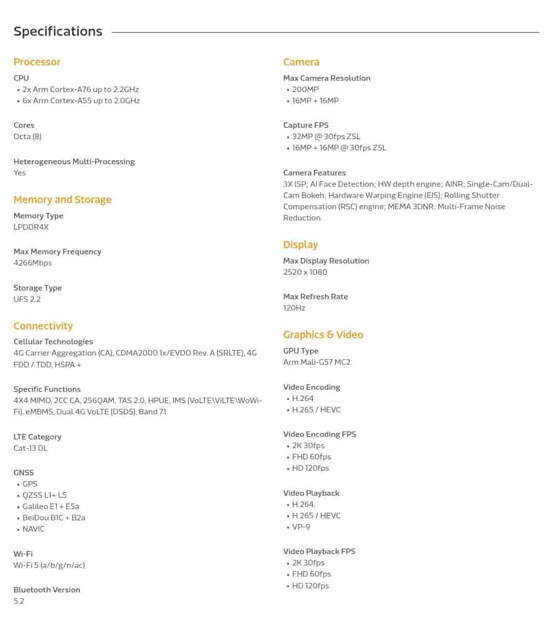 The chipset supports an FHD+ display with a 120Hz maximum refresh rate. It is paired with Mali G57 MC2 GPU. It supports 2K video recording at 30fps, FHD @ 60fps and HD@120fps.