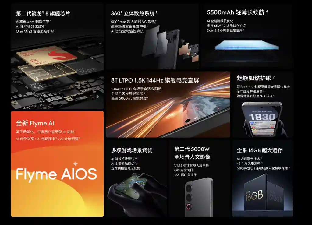 The front side of the smartphone sports a 16MP selfie camera. It comes with the capability to record up to 8K resolution video. It is backed by a 5,500mAh battery that supports 65W wired charging and comes in IP65 rated body. Its Flyme AIOS brings generative AI capabilities, and AI-related features like a circle to search, document summaries, and voice notes transcribed to text. The smartphone has been launched in two color options Black and White with minimum bezels around the punch-hole display. Three camera modules are arranged vertically on the rear in which two modules house the camera. Volume and power rockers are on the right side of the handset with a flat frame.