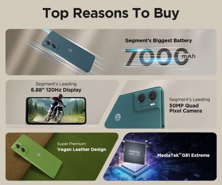 It will come with a Vegan Leather Design in Pantone Curated colours. The smartphone will be powered by the MediaTek G81 Extreme processor and arrive with an IP64-rated water-resistant design. It features stereo speakers with Dolby Atmos support. Other features- Family Space, ThinkShield Protection, Moto Secure, and Moto Gestures (twist to open the camera and chop chop for flashlight).