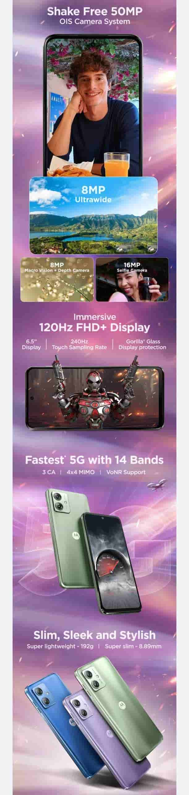 Moto G64 5G will feature a dual rear camera setup: 50MP(OIS) and an 8MP (Ultra Wide+Macro+Depth) camera. The front selfie shooter will have a 16MP camera setup.