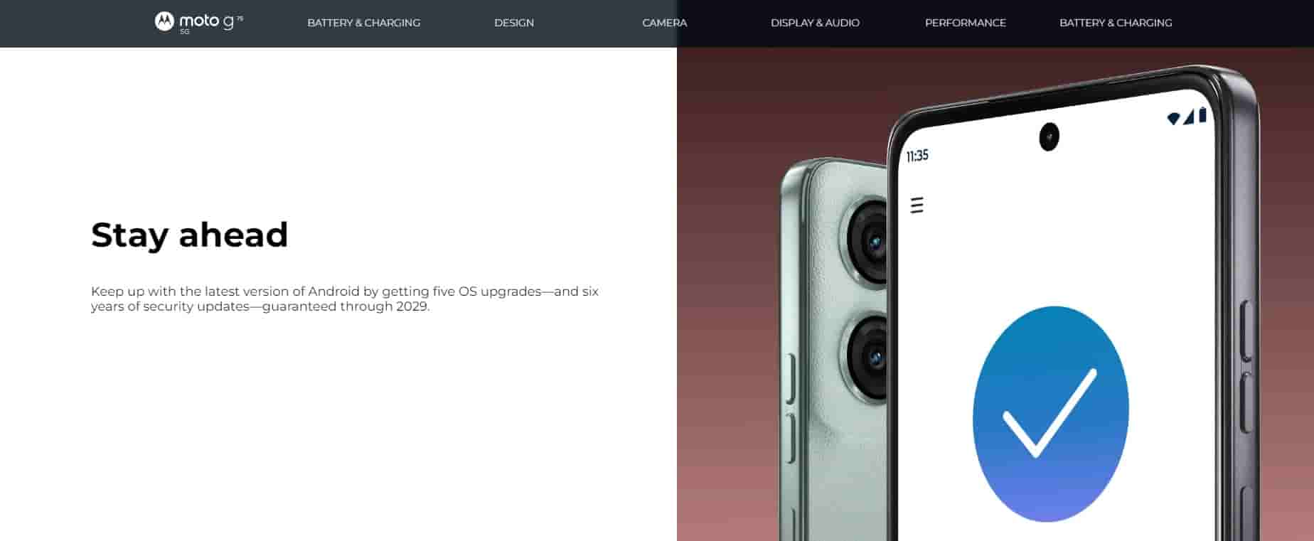 Audio features include stereo speakers with Dolby Atmos support and Hi-Res Audio certification. The device runs on Android 14 and includes Motorola’s Smart Connect feature, which allows for integration with other devices such as tablets, TVs, and Windows PCs. Also, Motorola promises to give 5 OS upgrades and 6 Years of Security patches till 2029.