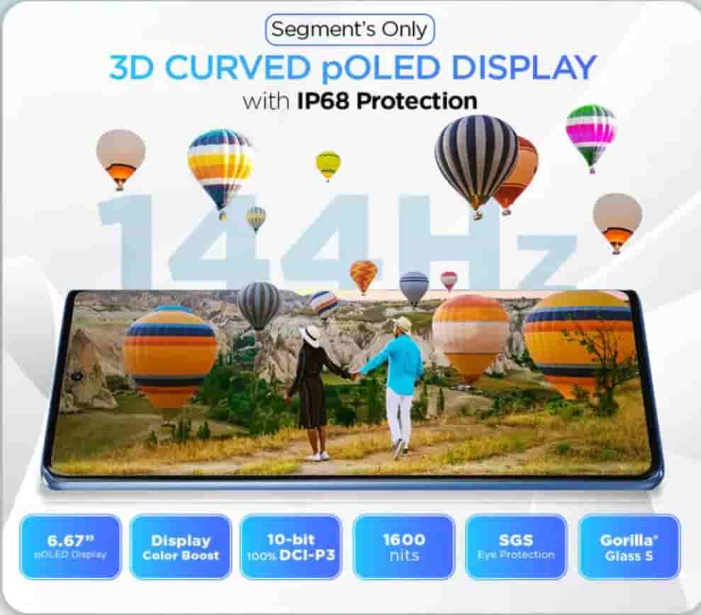 It sports a 6.67-inch 3D Curved pOLED display that offers 1600 nits brightness, 144Hz refresh rate and 10-bit 100% DCI-P3. It comes with Display Color Boost technology, SGS Eye protection and Corning Gorilla Glass 5 protection. The device will come with IP68 protection as well.