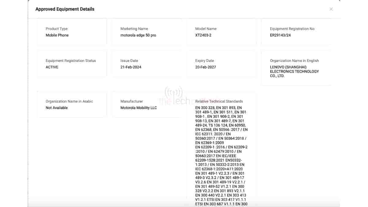Motorola Edge 50 Pro bears the model number XT2403-2, with certification number ER29143/24. However, aside from this information, not much else has been revealed through this certification.